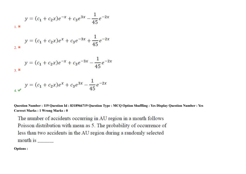 - (4) \(y = (c_1 + c_2 x)e^{x} + c_3 e^{3x} - \dfrac{1}{45}e^{-2x}\)