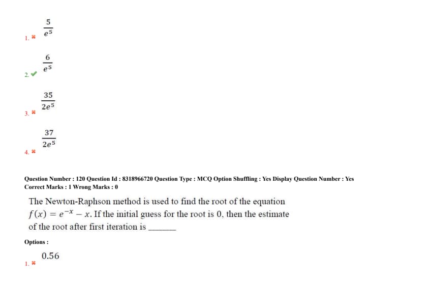 Using Newton-Raphson method to solve \(f(x) = e^{-x} - x\) with initial guess \(x_0 = 0\), find the next iteration.