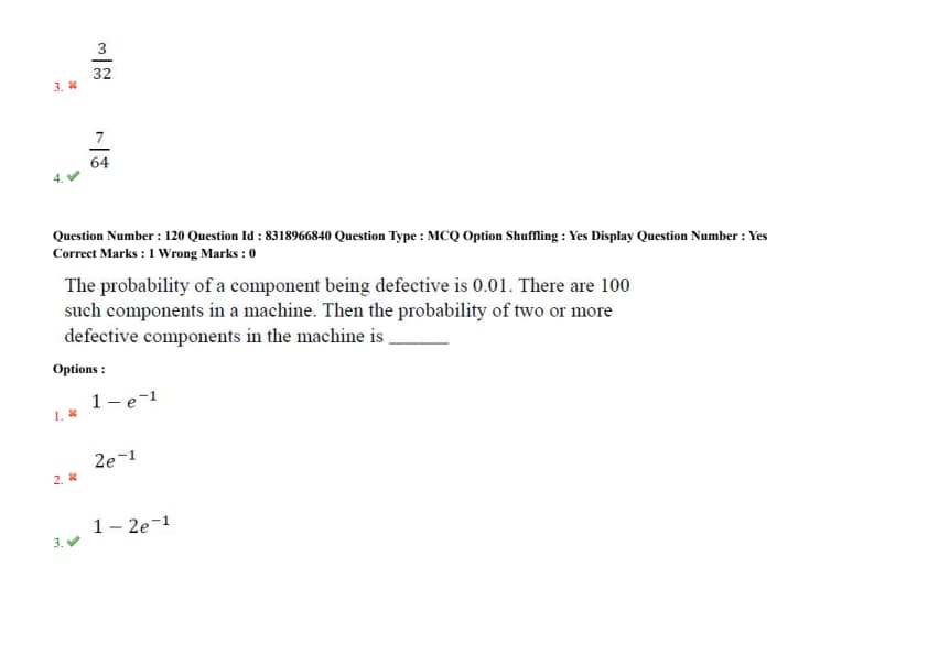 The probability of a component being defective is 0.01. There are 100 such components in a machine. Then the probability of two or more defective components in the machine is _____