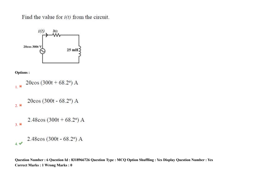- (4) 2.48\cos(300t - 68.2\(^\circ\)) A