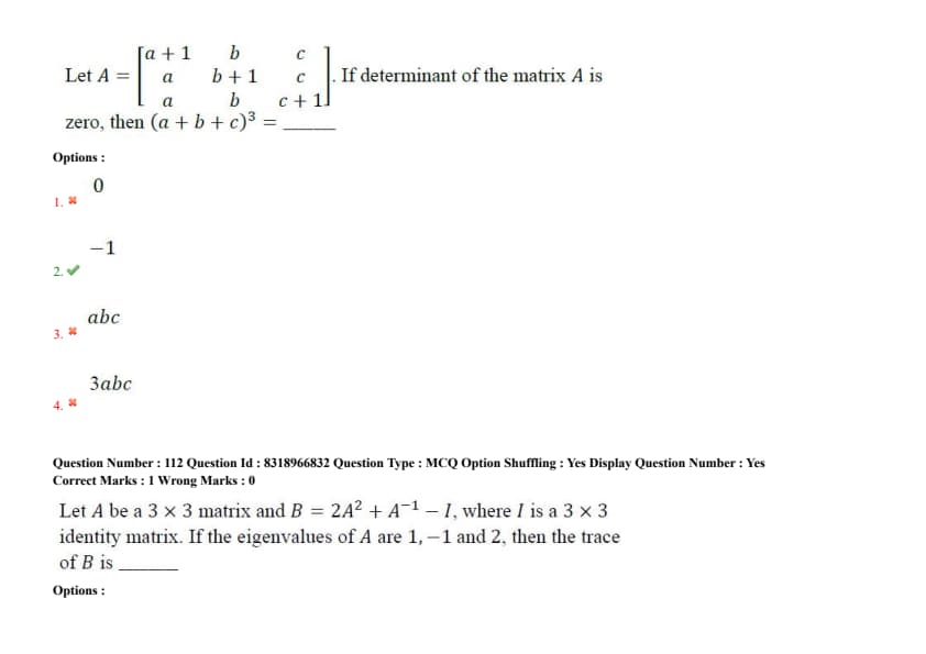 a & b & c+1 \end{bmatrix} \). If determinant of the matrix \( A \) is zero, then \( (a + b + c)^3 = \_\_\_\_\_\_ \)