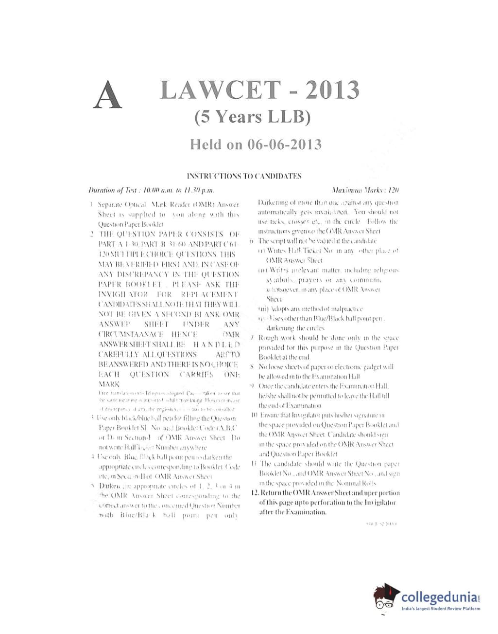 TS LAWCET 2013 Sridevi S1 Question paper with answer key pdf conducted on June 6, 2013 is available for download. The exam was successfully organized by Osmania University, Hyderabad. The question paper comprised a total of 120.0 questions divided among three sections.