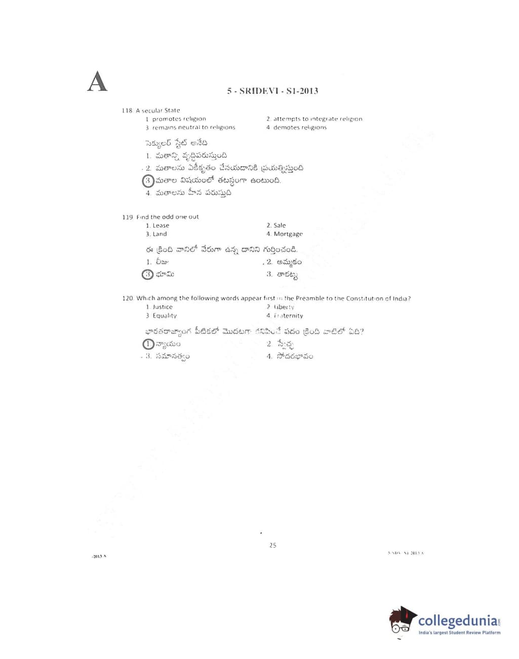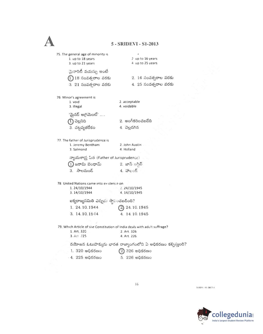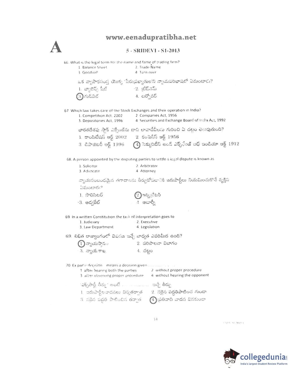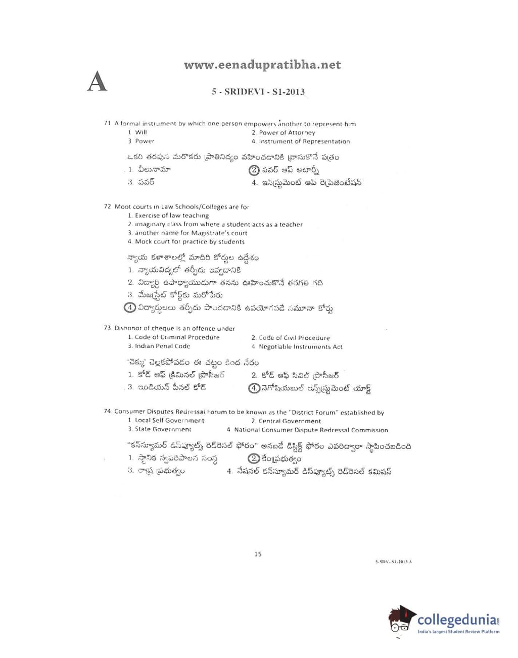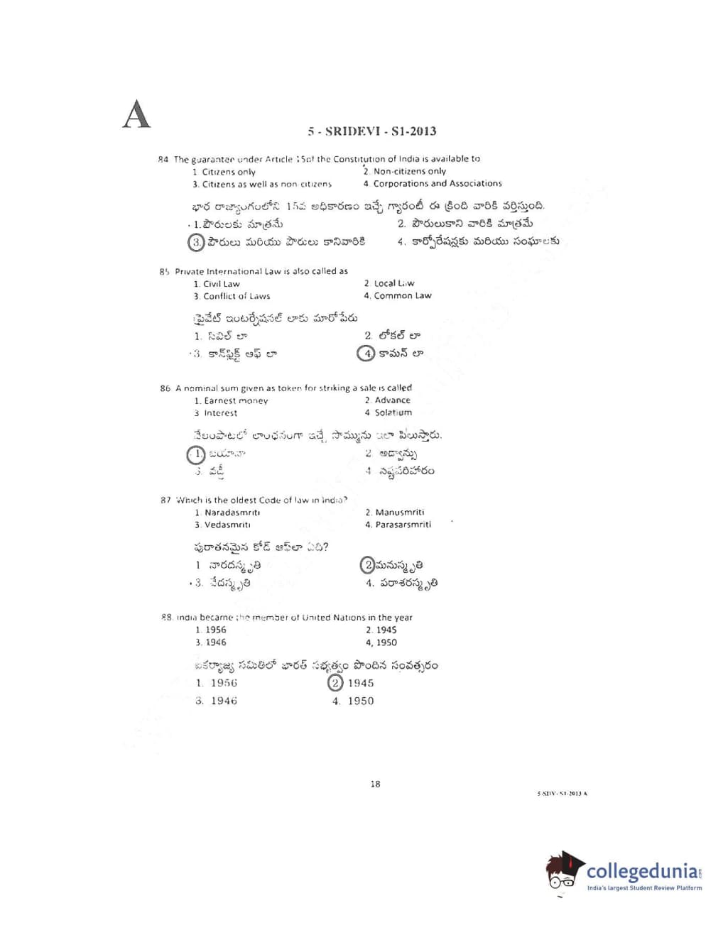 TS LAWCET 2013 Sridevi S1 Question Paper PDF TS LAWCET 2013 Sridevi S1 Answer Key PDF