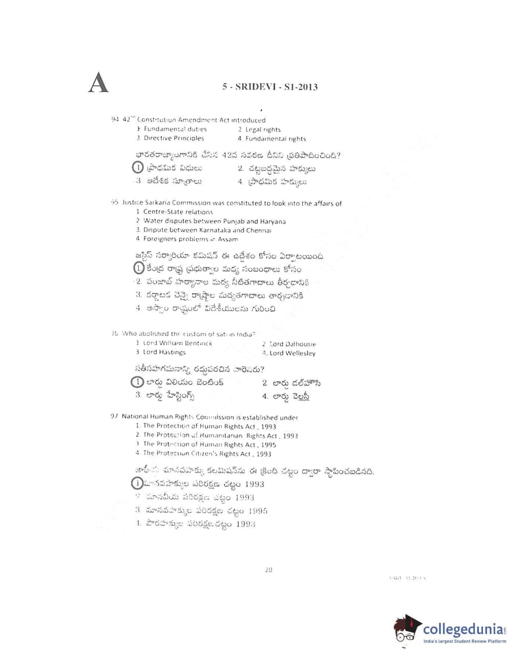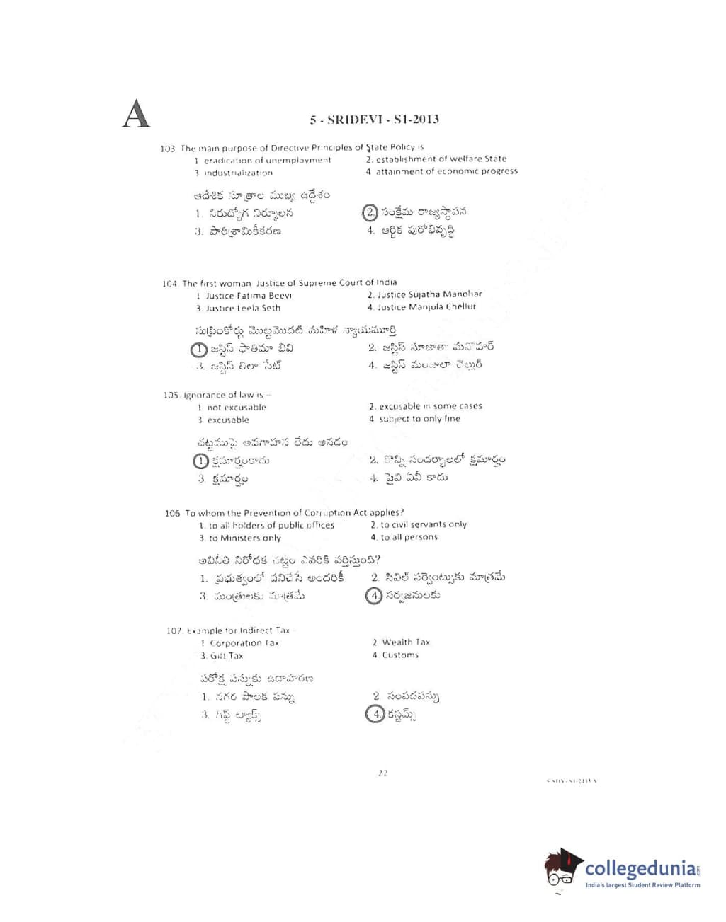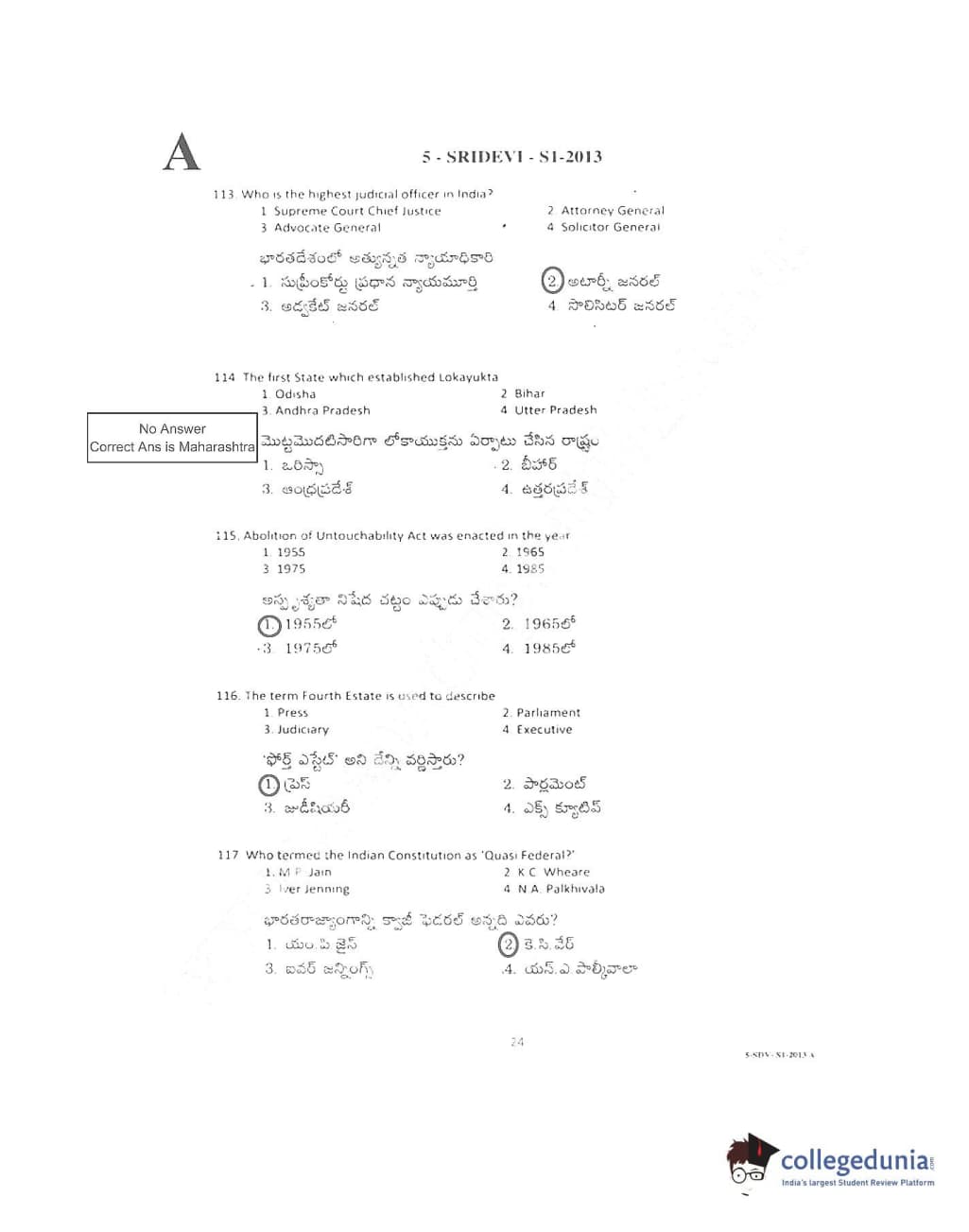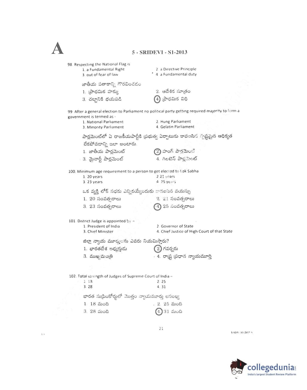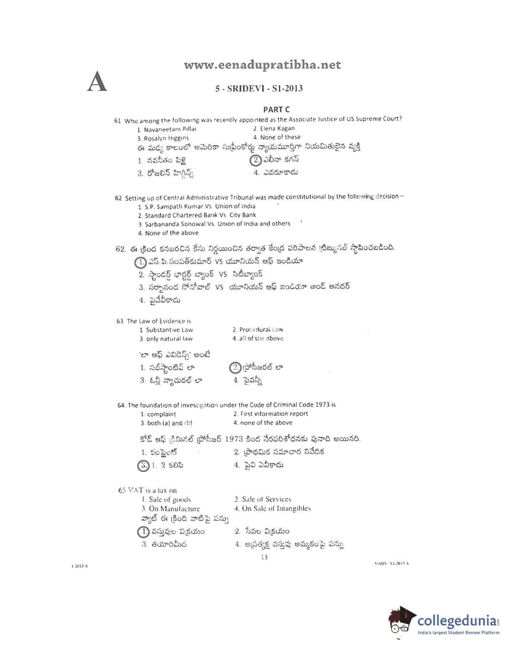 TS LAWCET 2013 Sridevi S1 Question Paper PDF TS LAWCET 2013 Sridevi S1 Answer Key PDF