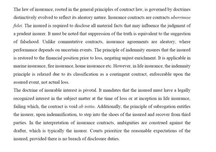 The law of insurance, rooted in the general principles of contract law, is governed by doctrines distinctively evolved to reflect its aleatory nature. Insurance contracts are contracts uberrimae fidei. The insured is required to disclose all material facts that may influence the judgment of a prudent insurer. It must be noted that suppression of the truth is equivalent to the suggestion of falsehood. Unlike commutative contracts, insurance agreements are aleatory, where performance depends on uncertain events. The principle of indemnity ensures that the insured is restored to the financial position prior to loss, negating unjust enrichment. It is applicable in marine insurance, fire insurance, home insurance etc. However, in life insurance, the indemnity principle is relaxed due to its classification as a contingent contract, enforceable upon the assured event, not actual loss. The doctrine of insurable interest is pivotal. It mandates that the insured must have a legally recognized interest in the subject matter at the time of loss or at inception in life insurance, failing which, the contract is void ab initio. Additionally, the principle of subrogation entitles the insurer, upon indemnification, to step into the shoes of the insured and recover from third parties. In the interpretation of insurance contracts, ambiguities are construed against the drafter, which is typically the insurer. Courts prioritize the reasonable expectations of the insured, provided there is no breach of disclosure duties.