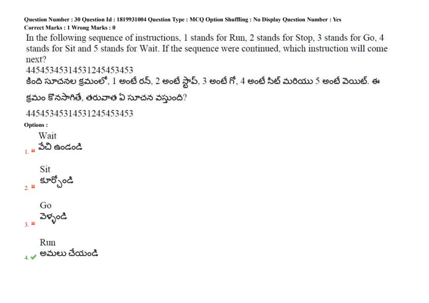 In the following sequence of instructions, 1 stands for Run, 2 stands for Stop, 3 stands for Go, 4 stands for Sit and 5 stands for Wait. If the sequence were continued, which instruction will come next?