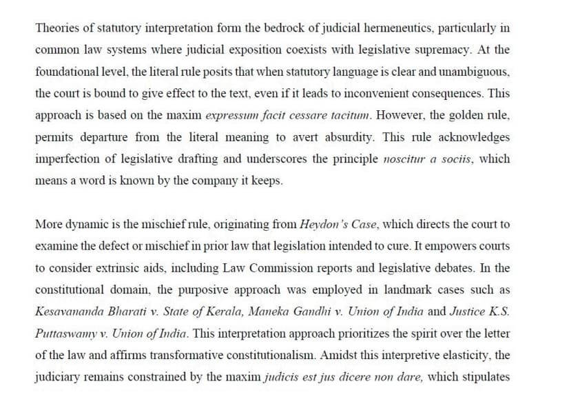 legislative debates. In the constitutional domain, the purposive approach was employed in landmark cases such as Kesavananda Bharati v. State of Kerala, Maneka Gandhi v. Union of India and Justice K.S. Puttaswamy v. Union of India. This interpretation approach prioritizes the spirit over the letter of the law and affirms transformative constitutionalism. Amidst this interpretive elasticity, the judiciary remains constrained