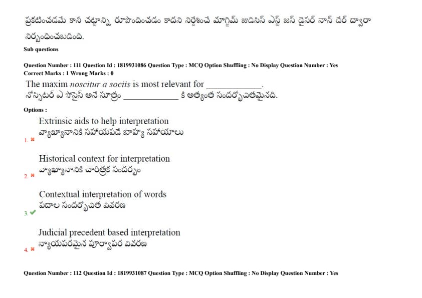 Option (4) Judicial precedent-based interpretation involves interpreting laws based on previous court decisions, which is a different approach from the contextual interpretation based on the surrounding words.