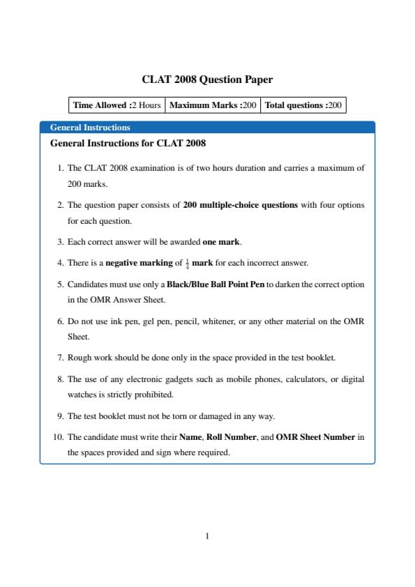 CLAT 2008 Common Question paper with answer key pdf conducted on May 11, 2008 in Afternoon Session 3:00 PM to 5:00 PM is available for download. The exam was successfully organized by Rajiv Gandhi National Law University. In terms of difficulty level, CLAT was of Easy to Moderate level. The question paper comprised a total of 200 questions divided among five sections.