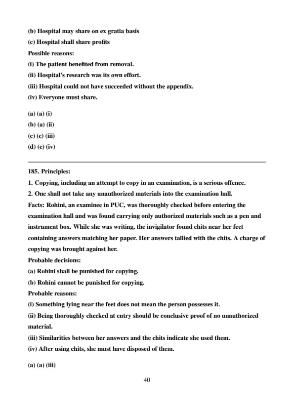 Rohini, an examinee in PUC, was thoroughly checked before entering the examination hall and was found carrying only authorized materials such as a pen and instrument box. While she was writing, the invigilator found chits near her feet containing answers matching her paper. Her answers tallied with the chits. A charge of copying was brought against her.
