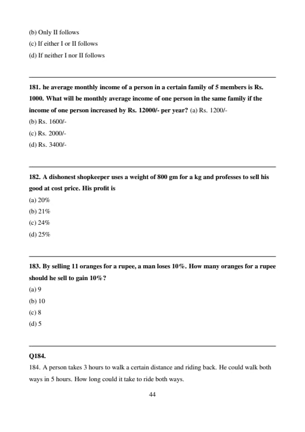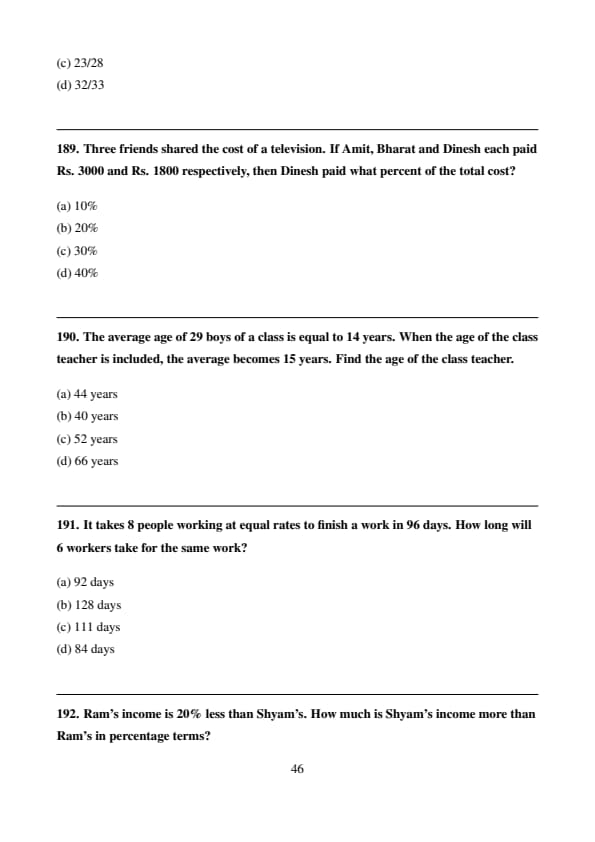 I could not confidently read the scanned question text for Q189 — the amounts assigned to Amit, Bharat and Dinesh appear garbled (the phrase "each paid Rs. 3000 and Rs. 1800 respectively" is inconsistent). To compute Dinesh's percentage of the total we need the three contributions (Amit, Bharat, Dinesh).