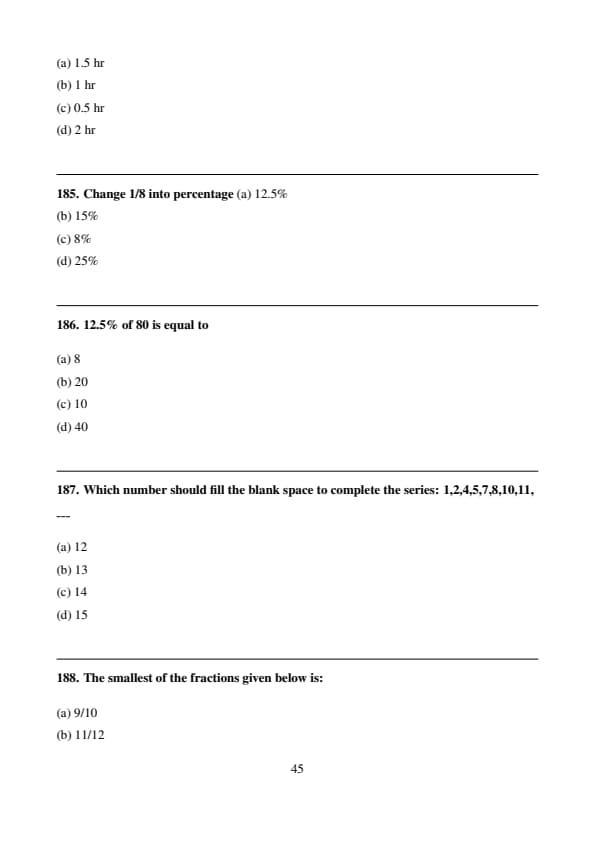 Hence option (a). Quick Tip: Remember common fraction↔percentage conversions: \(\tfrac{1}{2}=50%\), \(\tfrac{1}{4}=25%\), \(\tfrac{1}{5}=20%\), \(\tfrac{1}{8}=12.5%\).