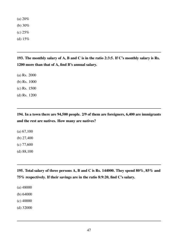 Hence C's salary = Rs. 64,000. Quick Tip: Express savings in terms of salary and a common multiplier to convert a ratio into absolute salaries.
