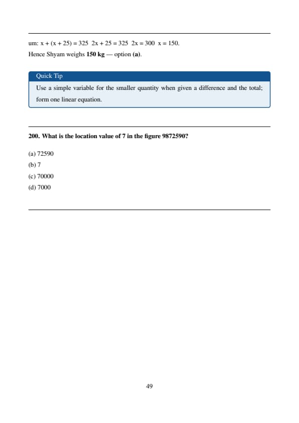 Hence the correct answer is (c) 70000. Quick Tip: Count places from the right (units = 10^0) to determine the place value: tens = 10^1, hundreds = 10^2, thousands = 10^3, ten-thousands = 10^4, etc.