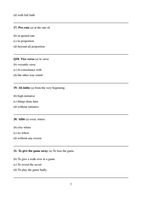 Thus, (c) correctly captures its meaning. Quick Tip: If a phrase has “pro,” think of “for” or “according to,” which can hint at proportional meaning.