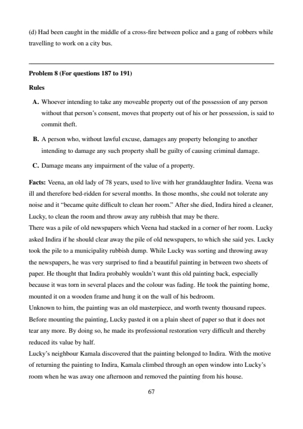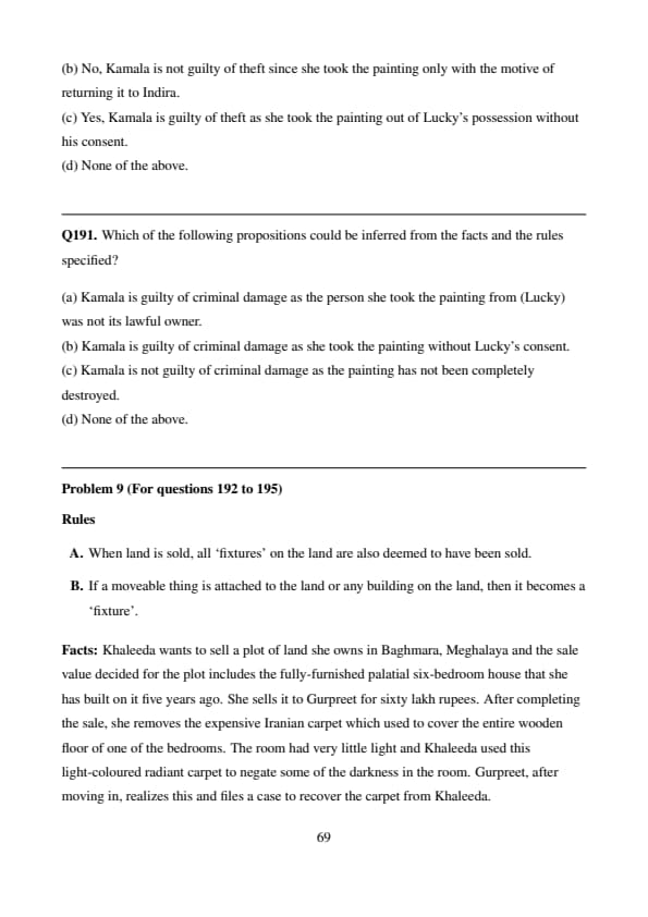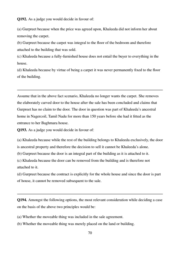 % Final Answer \[ \boxed{(d)} \] Quick Tip: Fixtures are determined not just by physical attachment but also by the intention to make something a permanent part of the property. Sentimental or ancestral value does not override the rules if the item is structurally integrated.