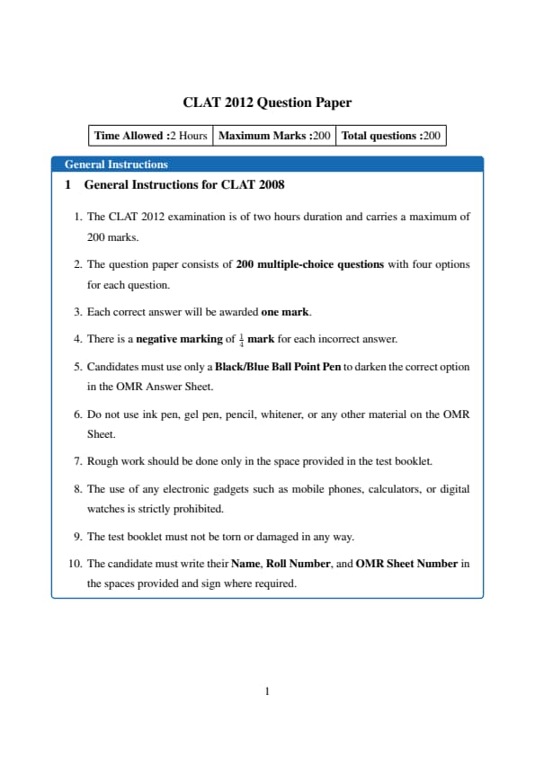 | CLAT 2012 Common Question Paper with Answer Key | Download PDF | Check Solutions |