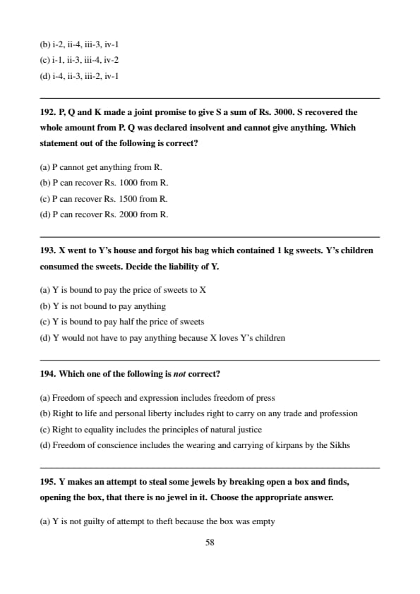 \[ \boxed{P can recover Rs. 1500 from R.} \] Quick Tip: In cases of joint promises, if one promisor is insolvent, the remaining solvent promisors share the default equally in addition to their own share.