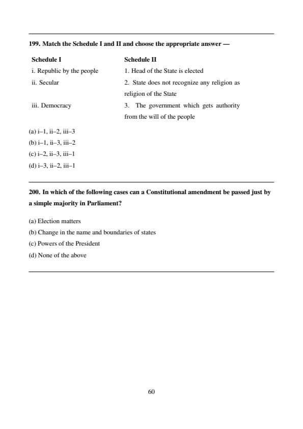 \[ \boxed{Correct match: i–1, ii–2, iii–3} \] Quick Tip: In constitutional terms: - Republic ensures no hereditary monarchy. - Secularism ensures state neutrality in religion. - Democracy ensures people’s participation in governance.