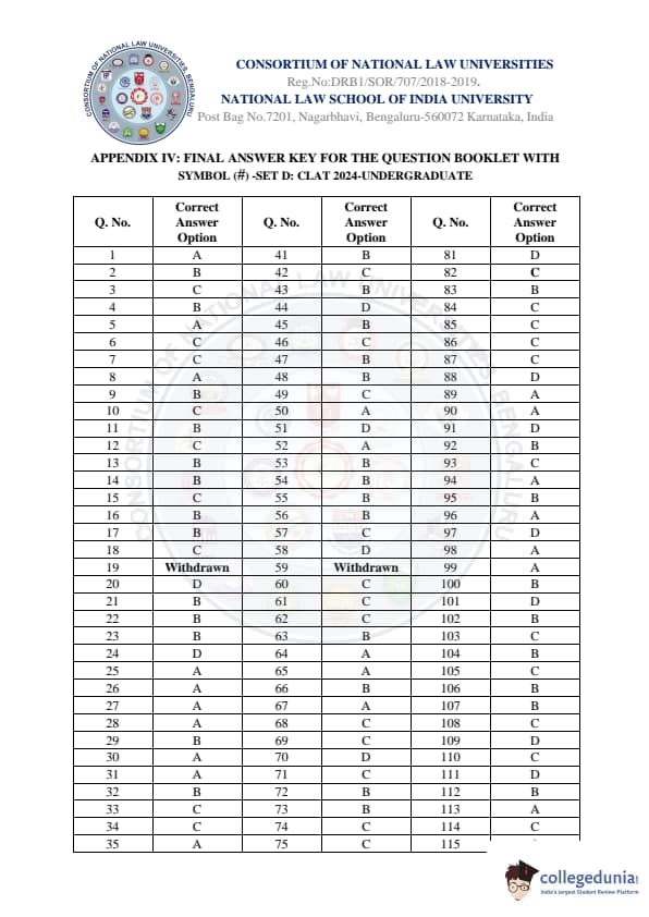 CLAT 2024 UG Question Paper Set D with Answer Key and Solution PDF is available for download. The exam was conducted by the Consortium of NLUs on December 3, 2023. Candidates were required to answer a total of 120 objective-type questions carrying 1 mark each covering five major sections: English Language, Current Affairs & General Knowledge, Legal Reasoning, Logical Reasoning and Quantitative Techniques.