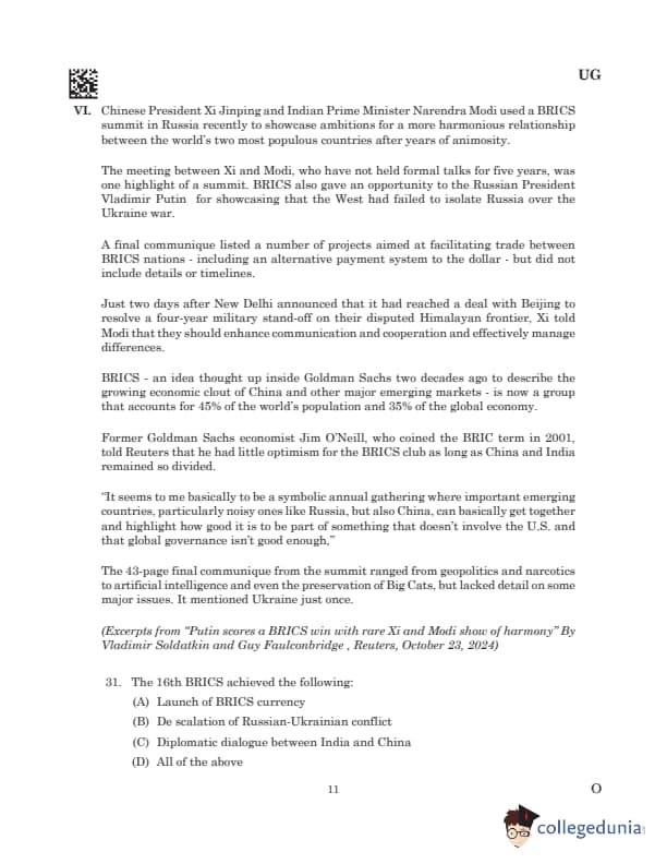 Passage VI: Chinese President Xi Jinping and Indian Prime Minister Narendra Modi used a BRICS summit in Russia recently to showcase ambitions for a more harmonious relationship between the world’s two most populous countries after years of animosity. The meeting between Xi and Modi, who have not held formal talks for five years, was one highlight of a summit. BRICS also gave an opportunity to the Russian President Vladimir Putin for showcasing that the West had failed to isolate Russia over the Ukraine war. A final communique listed a number of projects aimed at facilitating trade between BRICS nations - including an alternative payment system to the dollar - but did not include details or timelines. Just two days after New Delhi announced that it had reached a deal with Beijing to resolve a four-year military stand-off on their disputed Himalayan frontier, Xi told Modi that they should enhance communication and cooperation and effectively manage differences. BRICS - an idea thought up inside Goldman Sachs two decades ago to describe the growing economic clout of China and other major emerging markets - is now a group that accounts for 45% of the world’s population and 35% of the global economy. Former Goldman Sachs economist Jim O’Neill, who coined the BRIC term in 2001, told Reuters that he had little optimism for the BRICS club as long as China and India remained so divided. “It seems to me basically to be a symbolic annual gathering where important emerging countries, particularly noisy ones like Russia, but also China, can basically get together and highlight how good it is to be part of something that doesn’t involve the U.S. and that global governance isn’t good enough,” The 43-page final communique from the summit ranged from geopolitics and narcotics to artificial intelligence and even the preservation of Big Cats, but lacked detail on some major issues. It mentioned Ukraine just once.