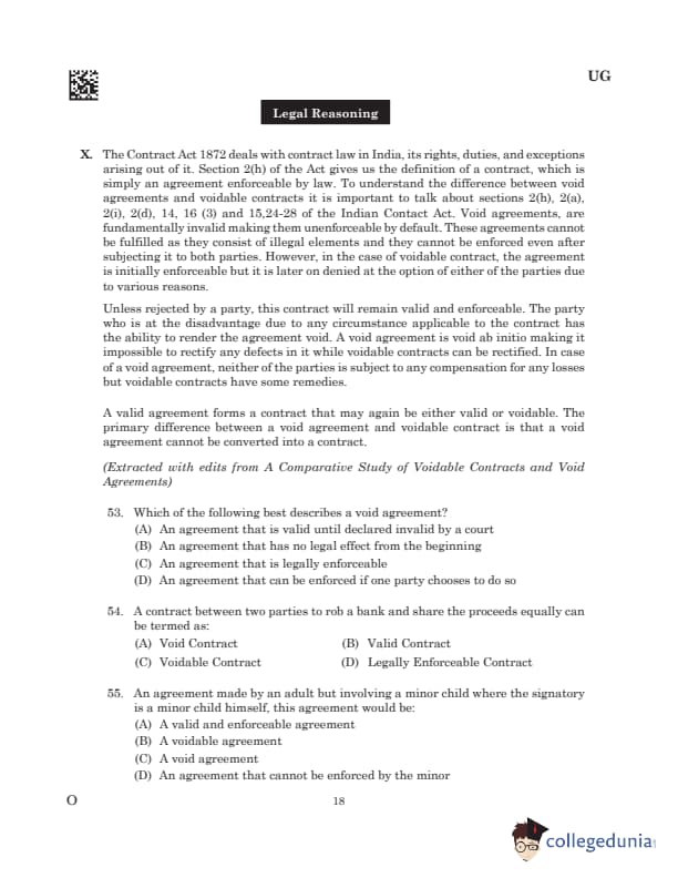 Passage X: The Contract Act 1872 deals with contract law in India, its rights, duties, and exceptions arising out of it. Section 2(h) of the Act gives us the definition of a contract, which is simply an agreement enforceable by law. To understand the difference between void agreements and voidable contracts it is important to talk about sections 2(h), 2(a), 2(i), 2(d), 14, 16 (3) and 15,24-28 of the Indian Contact Act. Void agreements, are fundamentally invalid making them unenforceable by default. These agreements cannot be fulfilled as they consist of illegal elements and they cannot be enforced even after subjecting it to both parties. However, in the case of voidable contract, the agreement is initially enforceable but it is later on denied at the option of either of the parties due to various reasons.