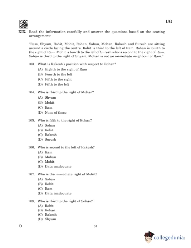“Ram, Shyam, Rohit, Mohit, Rohan, Sohan, Mohan, Rakesh and Suresh are sitting around a circle facing the centre. Rohit is third to the left of Ram. Rohan is fourth to the right of Ram. Mohit is fourth to the left of Suresh who is second to the right of Ram. Sohan is third to the right of Shyam. Mohan is not an immediate neighbour of Ram.”