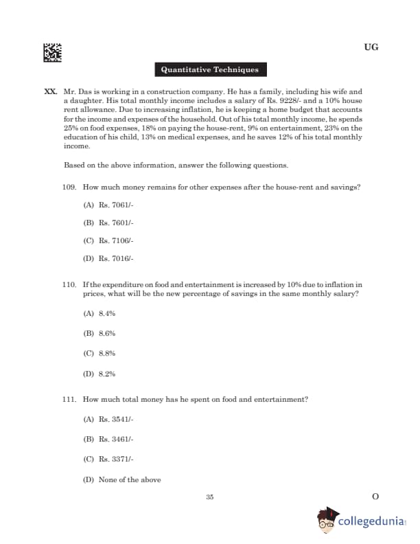 Passage XX: Mr. Das is working in a construction company. He has a family, including his wife and a daughter. His total monthly income includes a salary of Rs. 9228/- and a 10% house rent allowance. Due to increasing inflation, he is keeping a home budget that accounts for the income and expenses of the household. Out of his total monthly income, he spends 25% on food expenses, 18% on paying the house-rent, 9% on entertainment, 23% on the education of his child, 13% on medical expenses, and he saves 12% of his total monthly income.