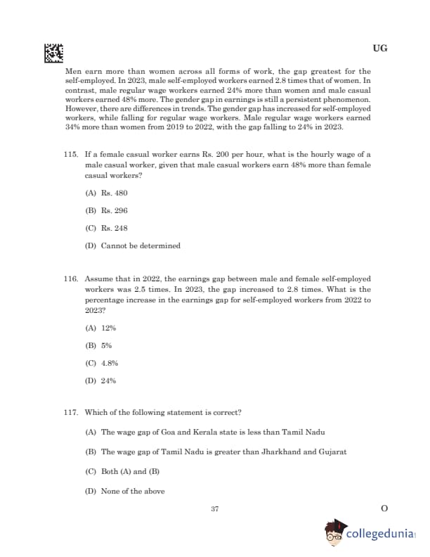 Passage XX: According to the estimates of the World Inequality Report 2022, in India, men earn 82 percent of the labour income, whereas women earn 18 percent of it. A woman agriculture field labourer makes Rs. 88 per day lesser than her male counterpart, according to the Ministry of Agriculture’s data for 2020-21. While a man is paid Rs. 383 a day on an average, a woman makes a mere Rs. 294 a day. The gap in their daily wages is more than the cost of two kilograms of rice. This gap differs from State to State. Field laborers, for instance, make the most money in Kerala. While a man gets Rs. 789 per day, a woman is paid Rs. 537. While this is the highest amount paid to a woman labourer in a State, it is also Rs. 252 lesser than what her male counterpart was paid. As of 2020-21, Tamil Nadu has the highest gender wage gap among agriculture field laborers at 112 per cent. It is followed by Goa (61 percent) and Kerala. The wage gap is the lowest in Jharkhand and Gujarat (6 percent each), but the women laborers there get paid just Rs. 239 and Rs. 247 per day, respectively. Men earn more than women across all forms of work, the gap greatest for the self-employed. In 2023, male self-employed workers earned 2.8 times that of women. In contrast, male regular wage workers earned 24% more than women and male casual workers earned 48% more. The gender gap in earnings is still a persistent phenomenon. However, there are differences in trends. The gender gap has increased for self-employed workers, while falling for regular wage workers. Male regular wage workers earned 34% more than women from 2019 to 2022, with the gap falling to 24% in 2023.