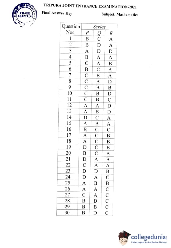 | Tripura JEE 2021 Mathematics Question Paper PDF | Tripura JEE 2021 Mathematics Answer Key PDF |