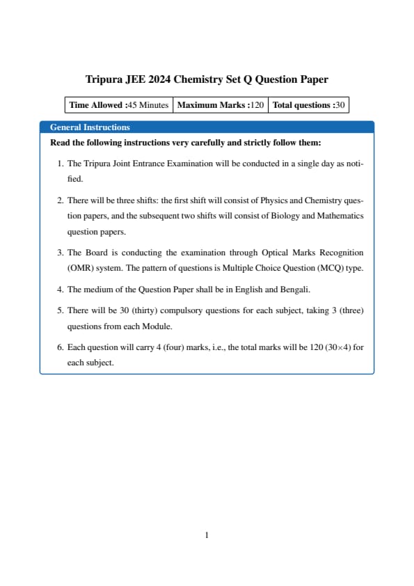 Tripura JEE 2024 Chemistry Set Q Question paper with answer key pdf is available for download. The exam was successfully organized by Tripura Board of Joint Entrance Examination (TBJEE). The question paper comprised a total of 30 questions. There is Multiple Choice Questions (MCQs) in exam.Each question will carry 4 (four) marks, i.e. total marks will be of 120 (30×4) for each subject.