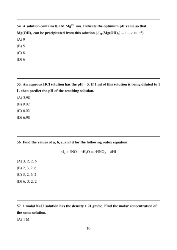 A solution contains 0.1 M \( Mg^{2+} \) ion. Indicate the optimum pH value so that \( Mg(OH)_2 \) can be precipitated from this solution (\( K_{sp}[Mg(OH)_2] = 1.0 \times 10^{-11} \)).