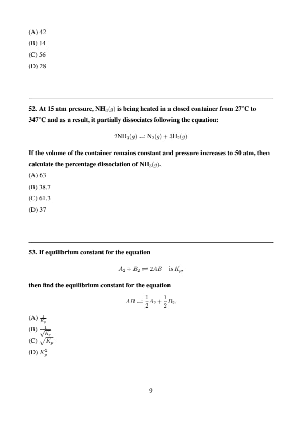 If equilibrium constant for the equation \[ A_2 + B_2 \rightleftharpoons 2AB \quad is \, K_p, \]