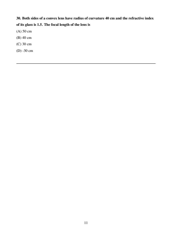 Both sides of a convex lens have radius of curvature 40 cm and the refractive index of its glass is 1.5. The focal length of the lens is