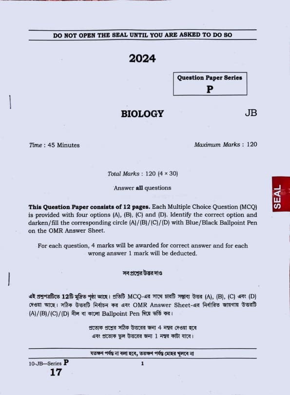 Tripura JEE 2024 Biology Question paper with answer key pdf conducted on April 24, 2024 is available for download. The exam was successfully organized by Tripura Board of Joint Entrance Examination (TBJEE). The question paper comprised a total of 30 questions.