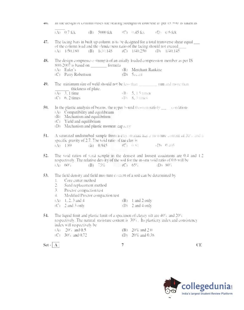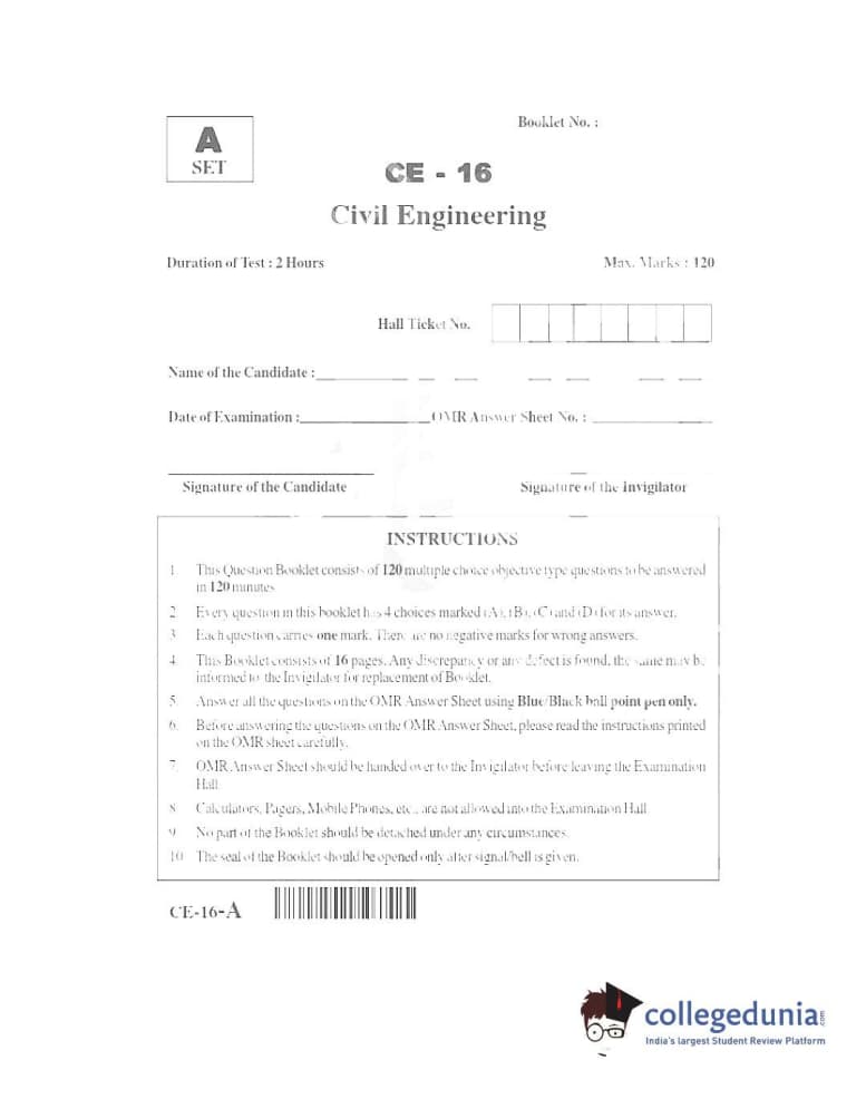 TS PGECET 2016 Civil Engineering Question paper with answer key pdf conducted on June 3, 2016 in Afternoon Session (2 PM to 4 PM) is available for download. The exam was successfully organized by Osmania University. The question paper comprised a total of 120 questions.