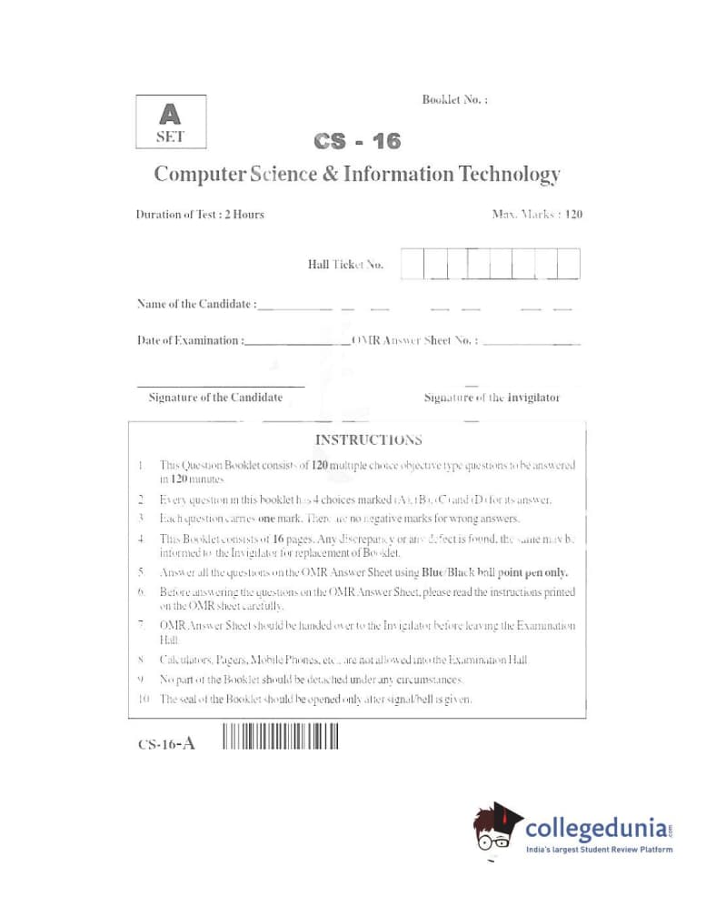 TS PGECET 2016 Computer Science and Information Technology Question paper with answer key pdf conducted on June 1, 2016 in Afternoon Session (2 PM to 4 PM) is available for download. The exam was successfully organized by Osmania University. The question paper comprised a total of 120 questions.