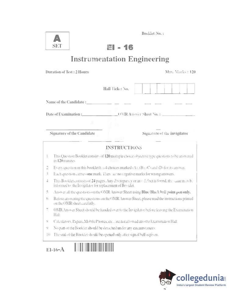 TS PGECET 2016 Instrumentation Engineering Question paper with answer key pdf conducted on June 1, 2016 in Forenoon Session (10 AM to 12 PM) is available for download. The exam was successfully organized by Osmania University. The question paper comprised a total of 120 questions.