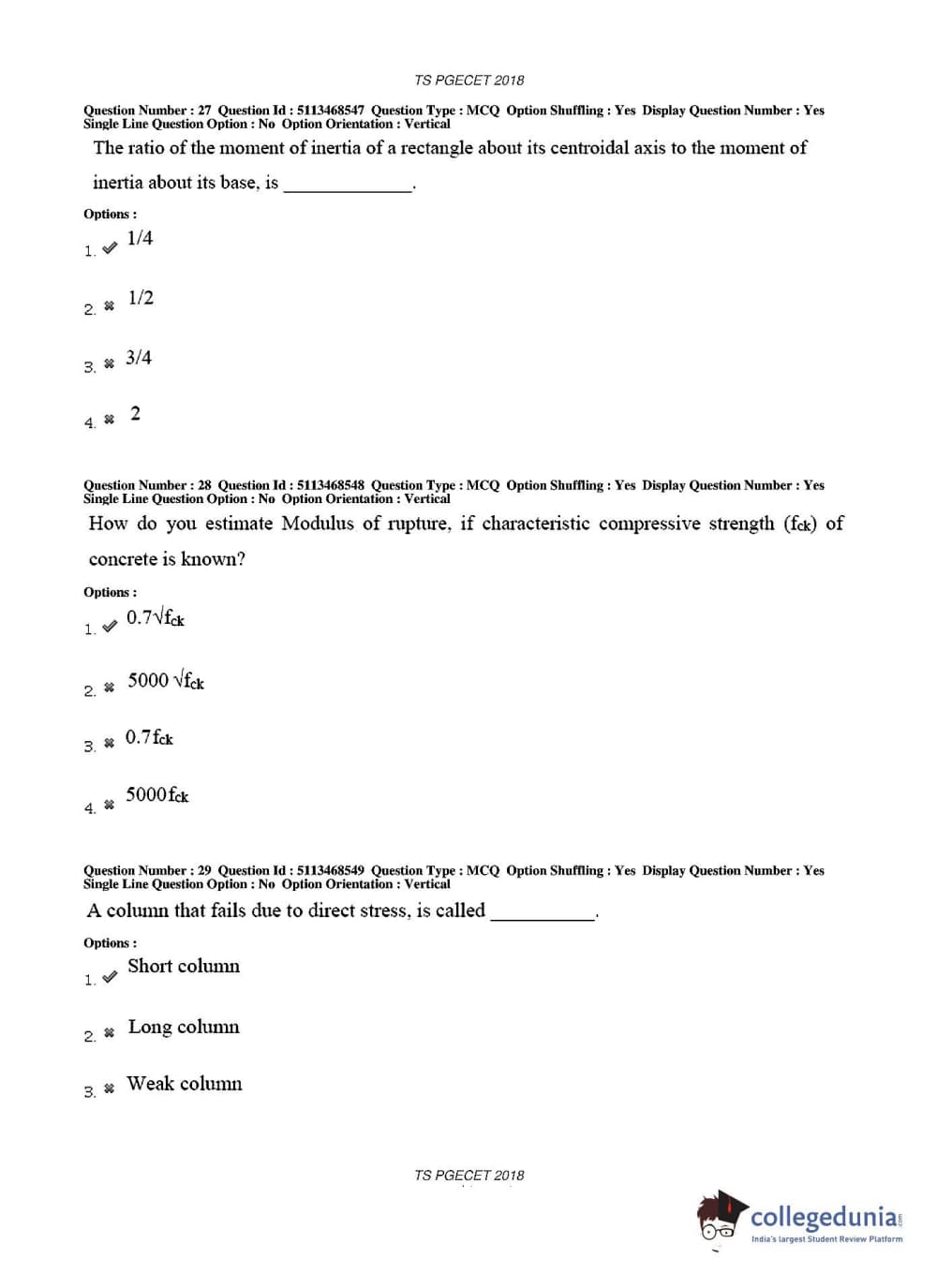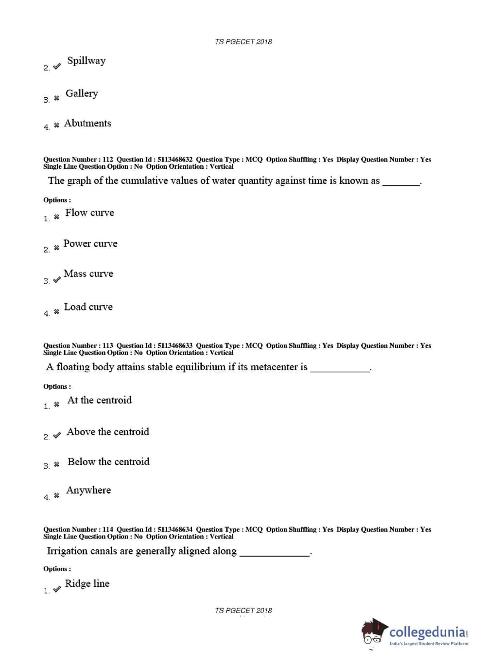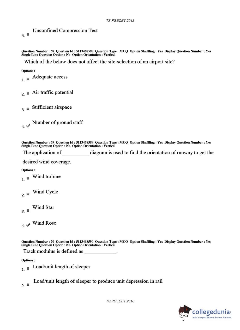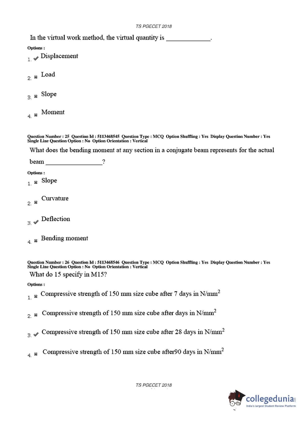 TS PGECET 2018 Civil Engineering Question paper with answer key pdf conducted on May 30, 2018 in Afternoon Session 2 PM to 4 PM is available for download. The exam was successfully organized by Osmania University. The question paper comprised a total of 120 questions.