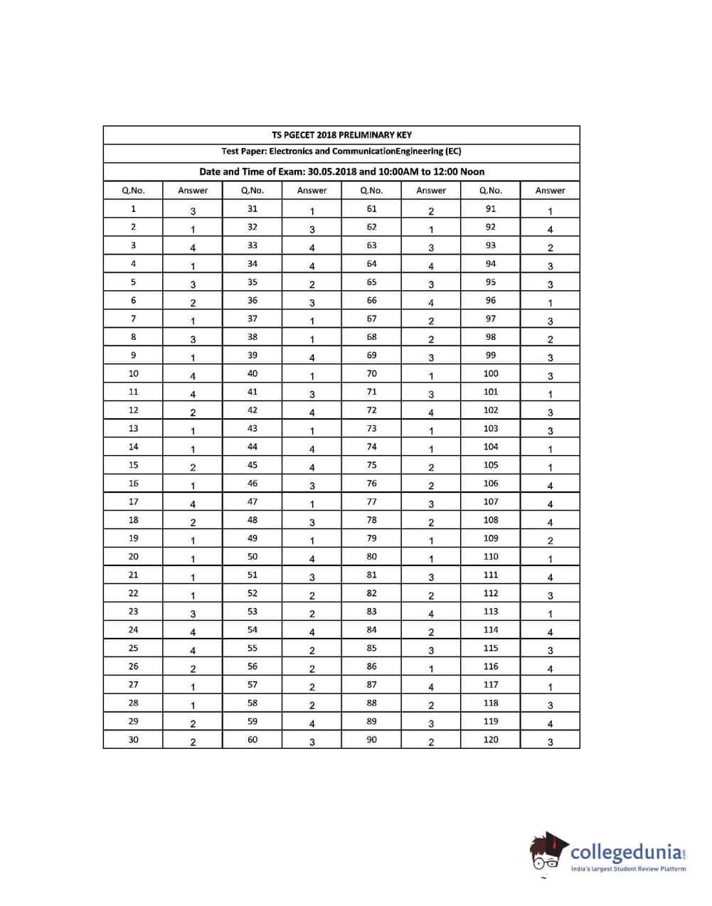 TS PGECET 2018 Electronics and Communication Engineering Question paper with answer key pdf conducted on May 30, 2018 in Forenoon Session 10 AM to 12 PM is available for download. The exam was successfully organized by Osmania University. The question paper comprised a total of 120 questions.
