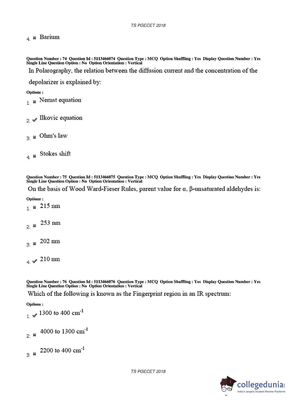 TS PGECET 2018 Pharmacy Question paper with answer key pdf conducted on May 29, 2018 in Forenoon Session 10 AM to 12 PM is available for download. The exam was successfully organized by Osmania University. The question paper comprised a total of 120 questions.