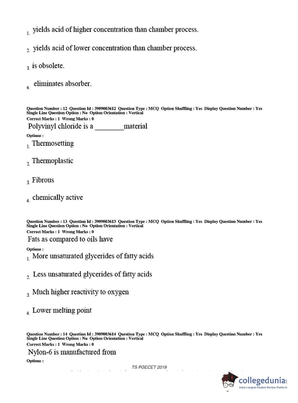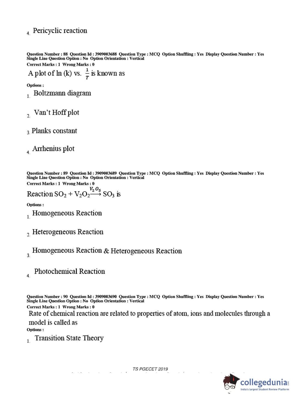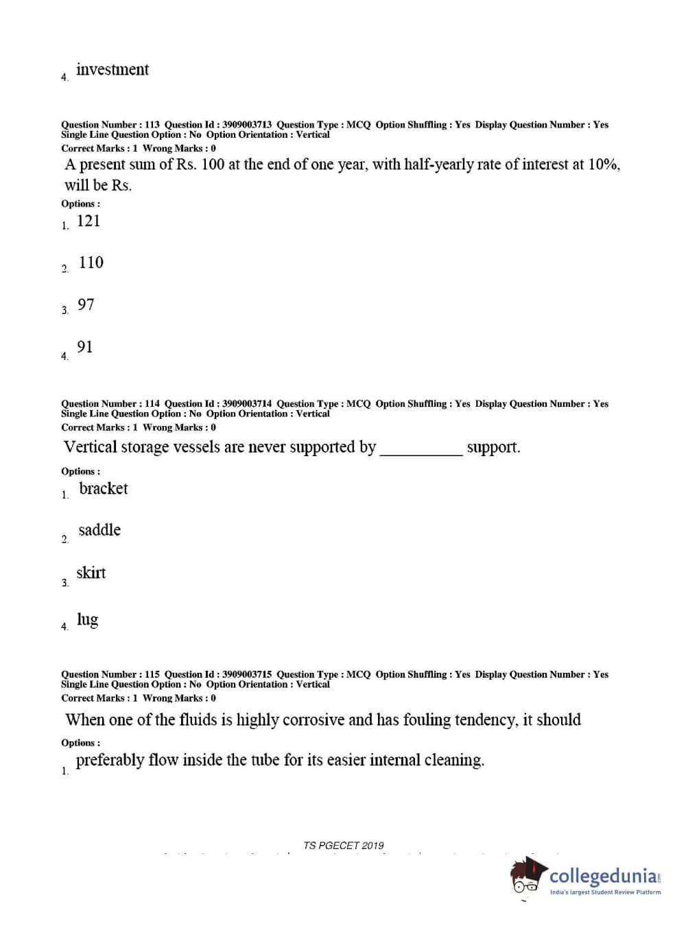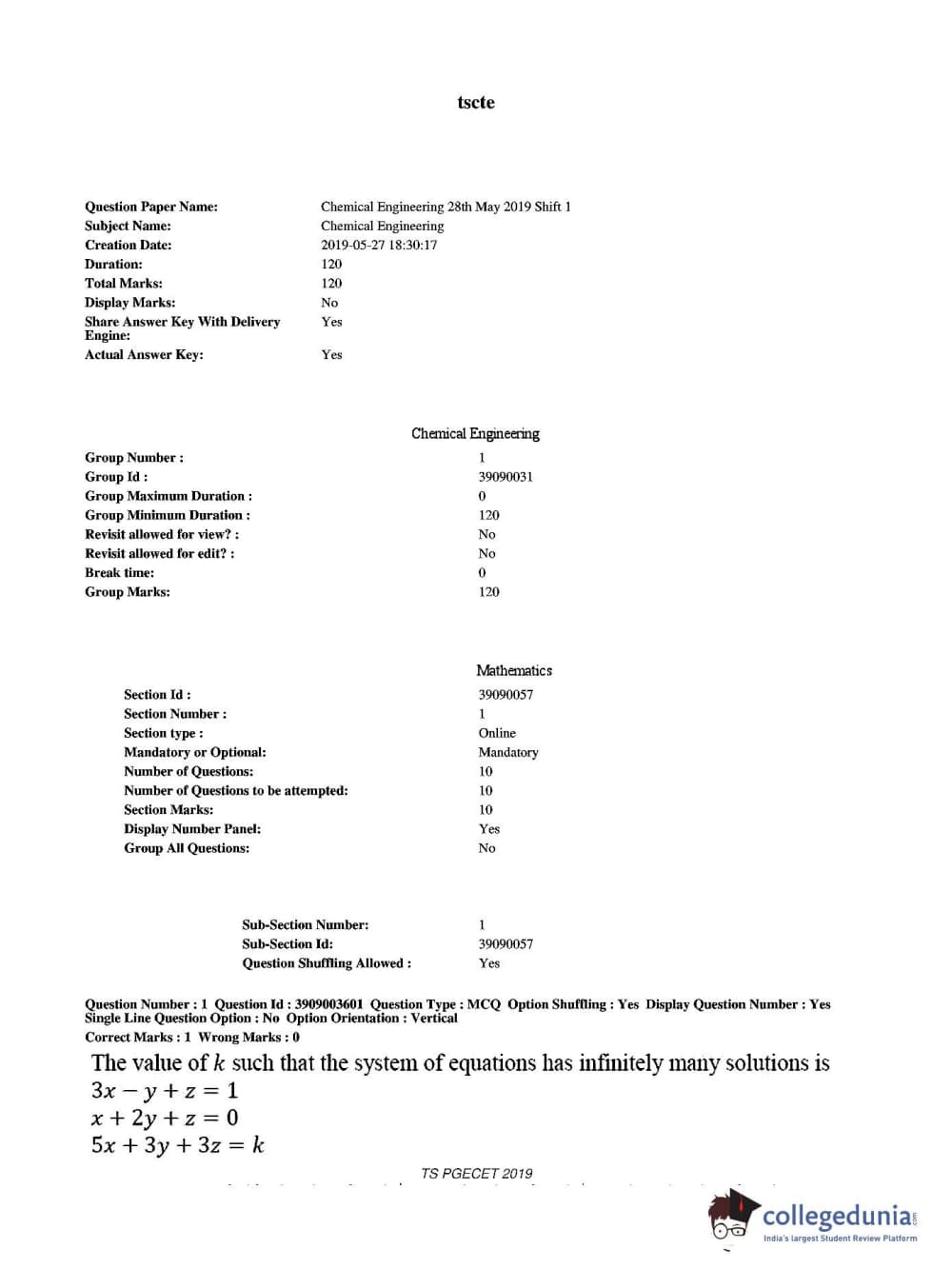 TS PGECET 2019 Chemical Engineering Question paper with answer key pdf conducted on May 28, 2019 from is available for download. The exam was successfully organized by Osmania University. The question paper comprised a total of 120 questions.