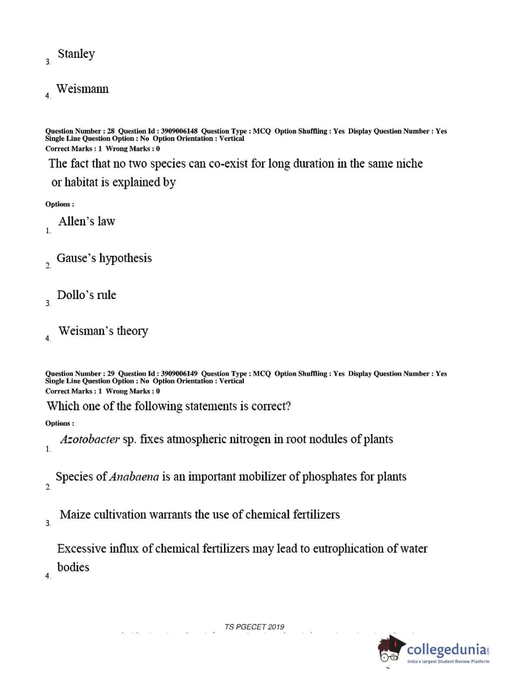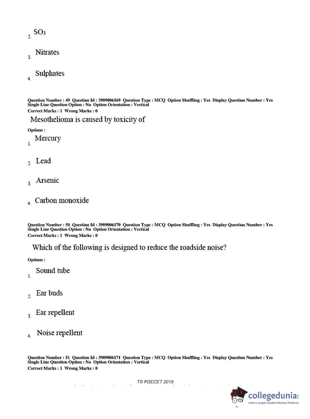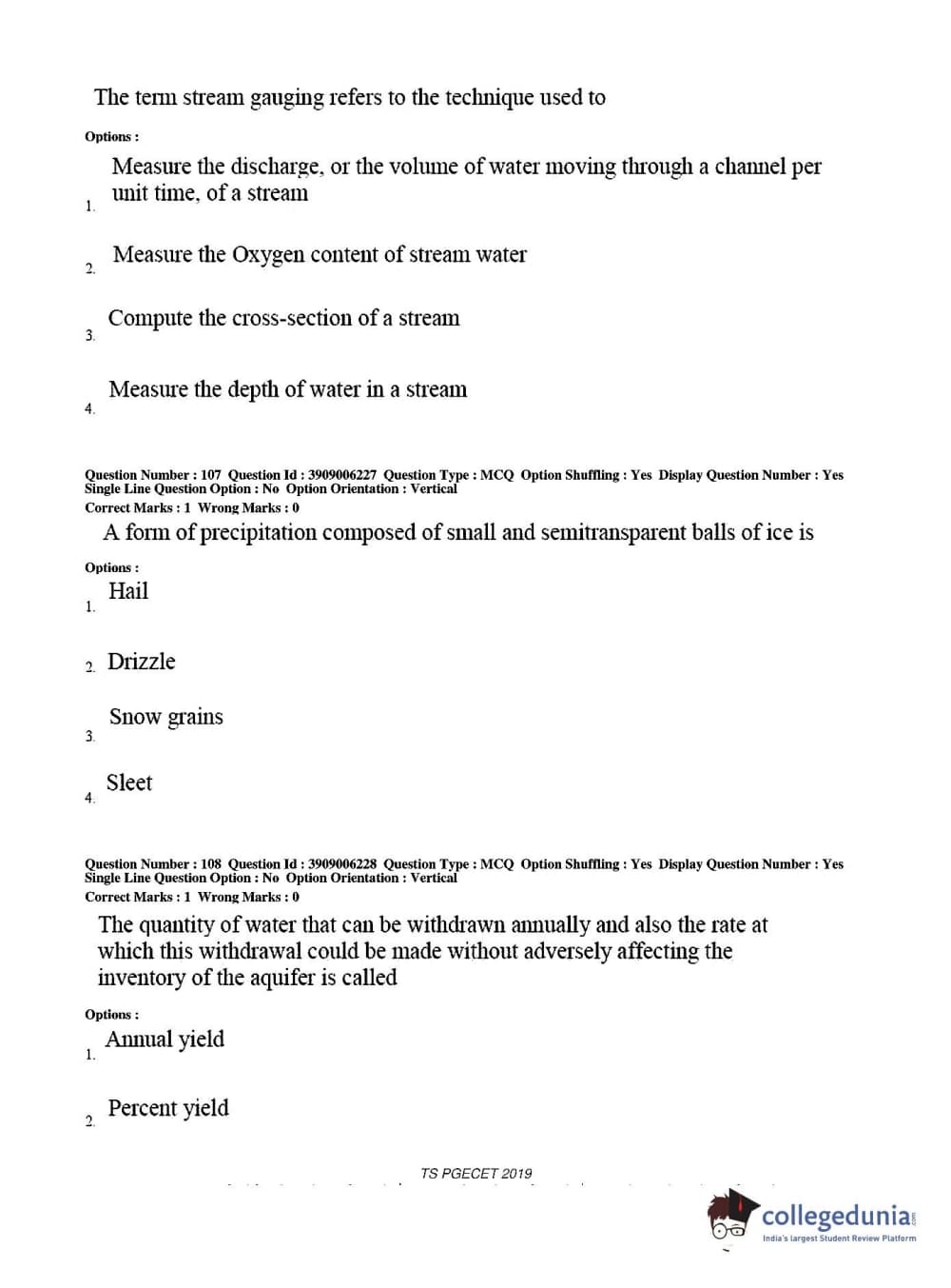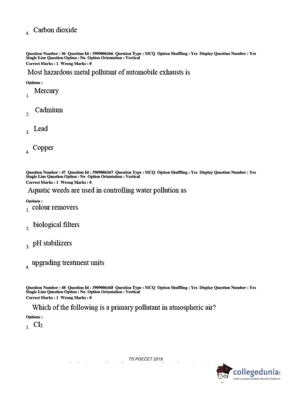 TS PGECET 2019 Environmental Management Question paper with answer key pdf conducted on May 31, 2019 from is available for download. The exam was successfully organized by Osmania University. The question paper comprised a total of 120 questions.