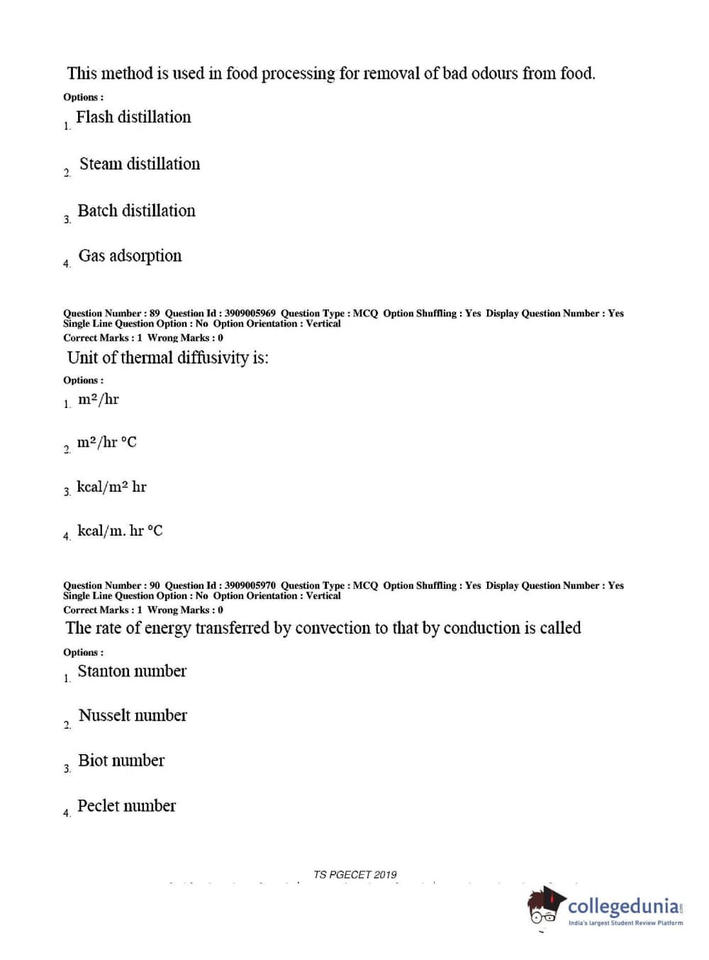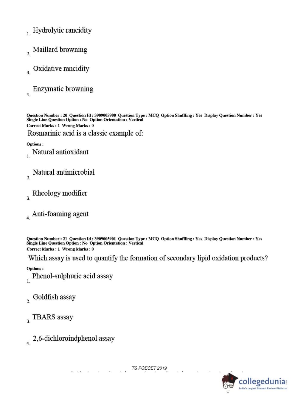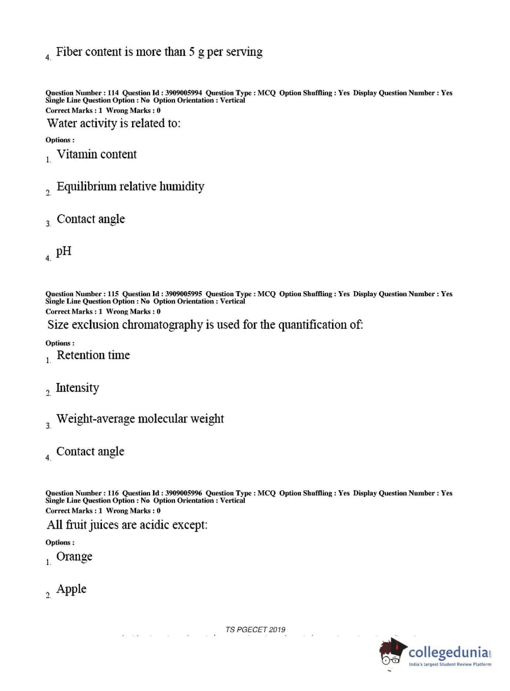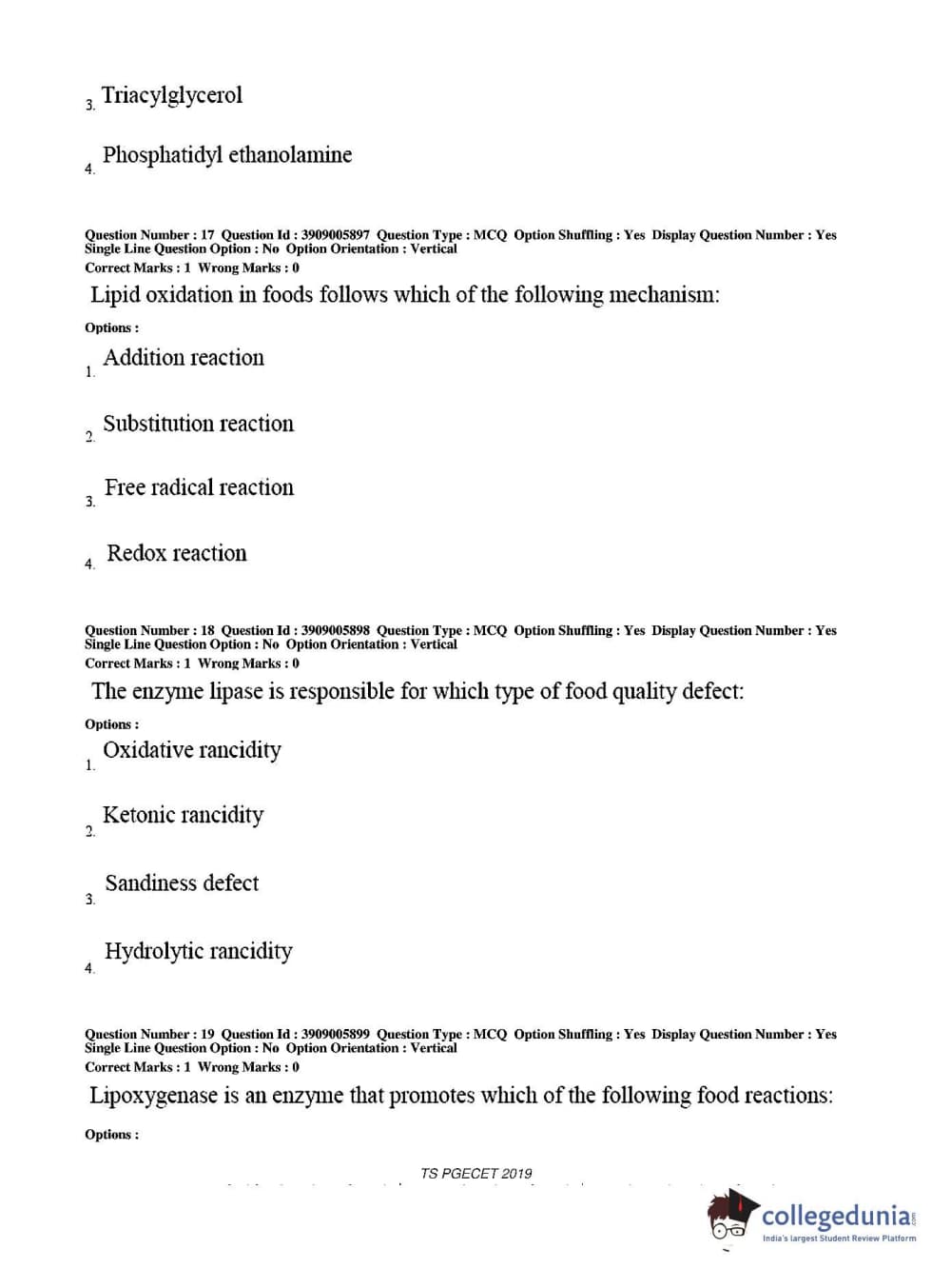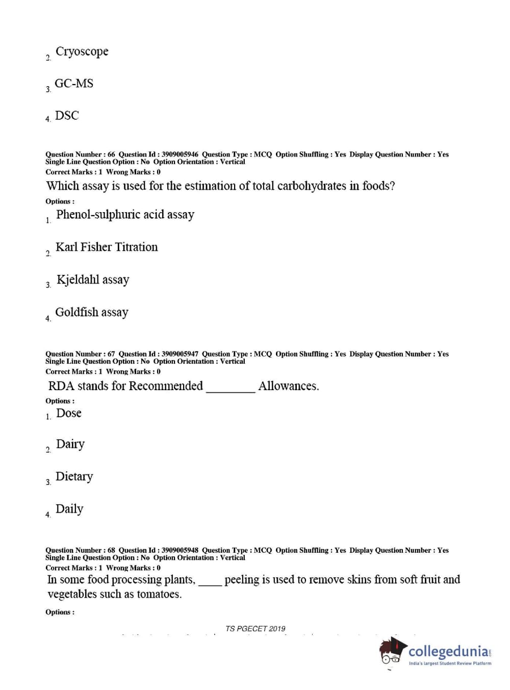 TS PGECET 2019 Food Technology Question Paper with Answer Key PDF for Afternoon Session