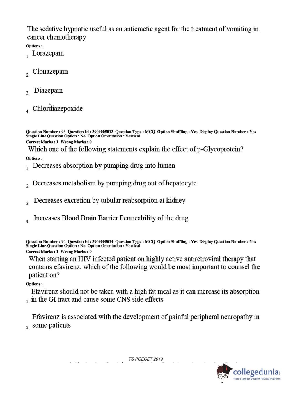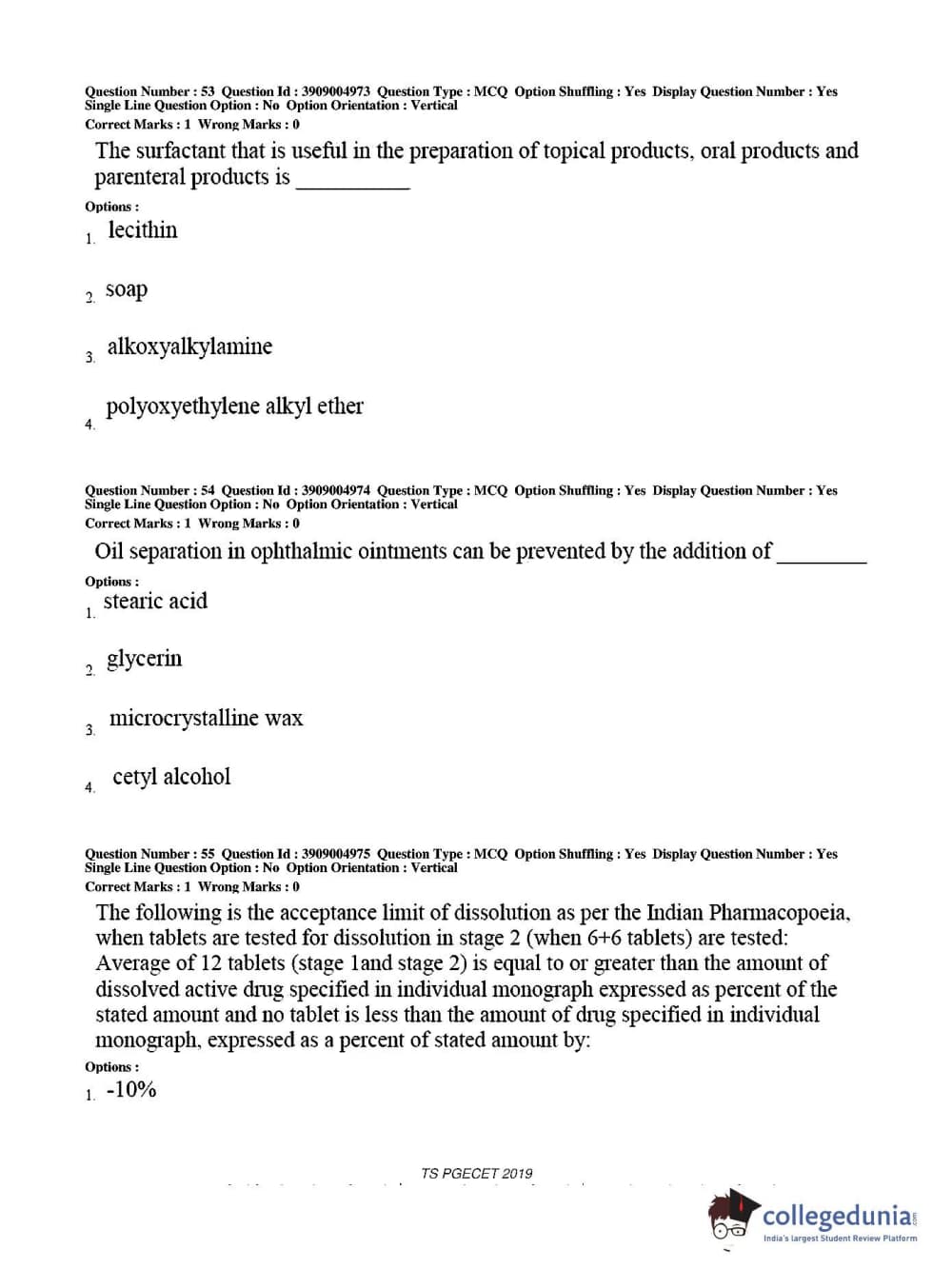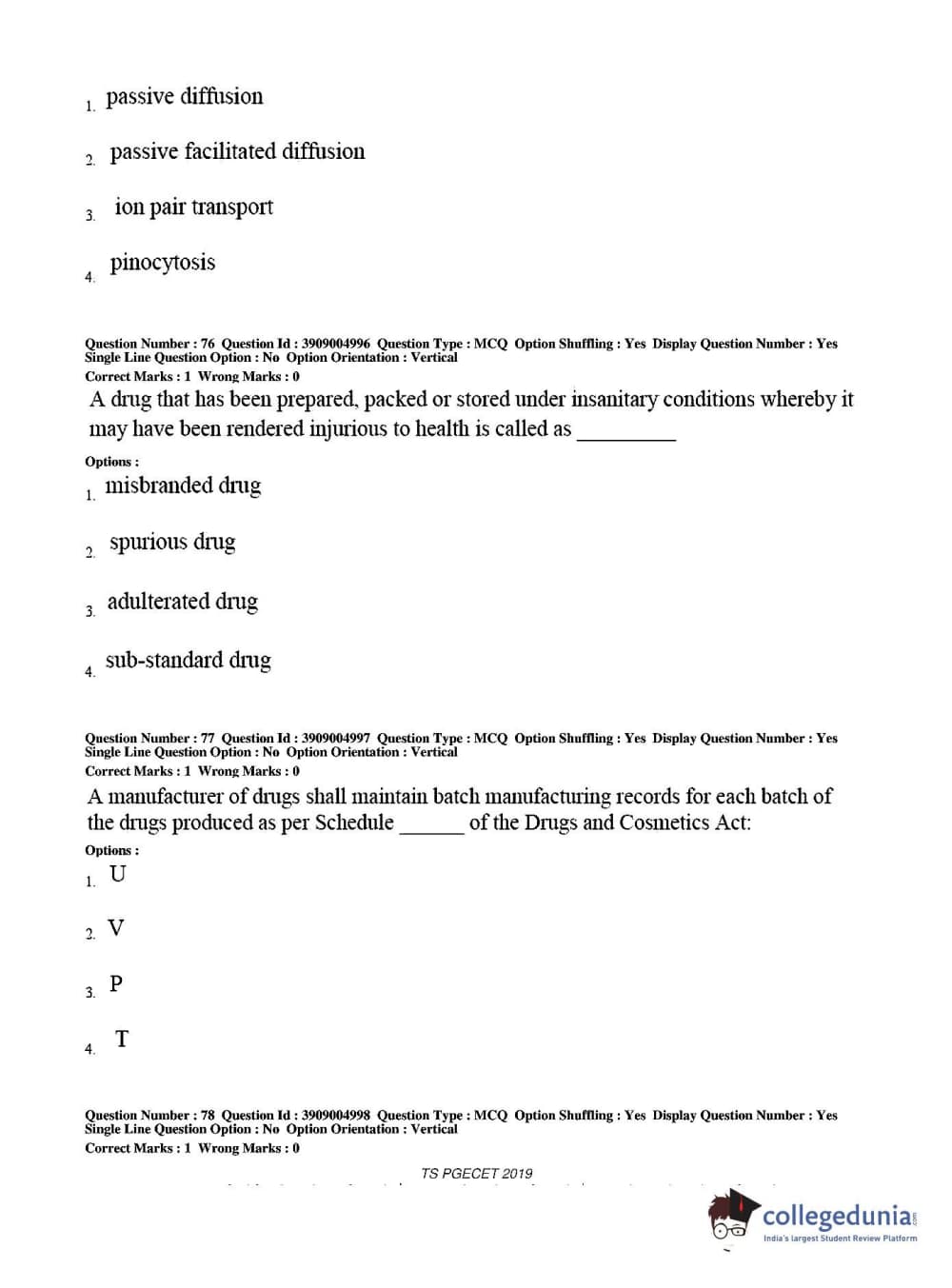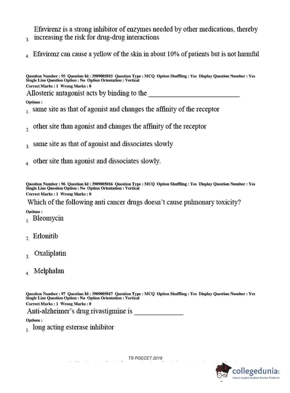 TS PGECET 2019 Pharmacy Question Paper with Answer Key PDF for