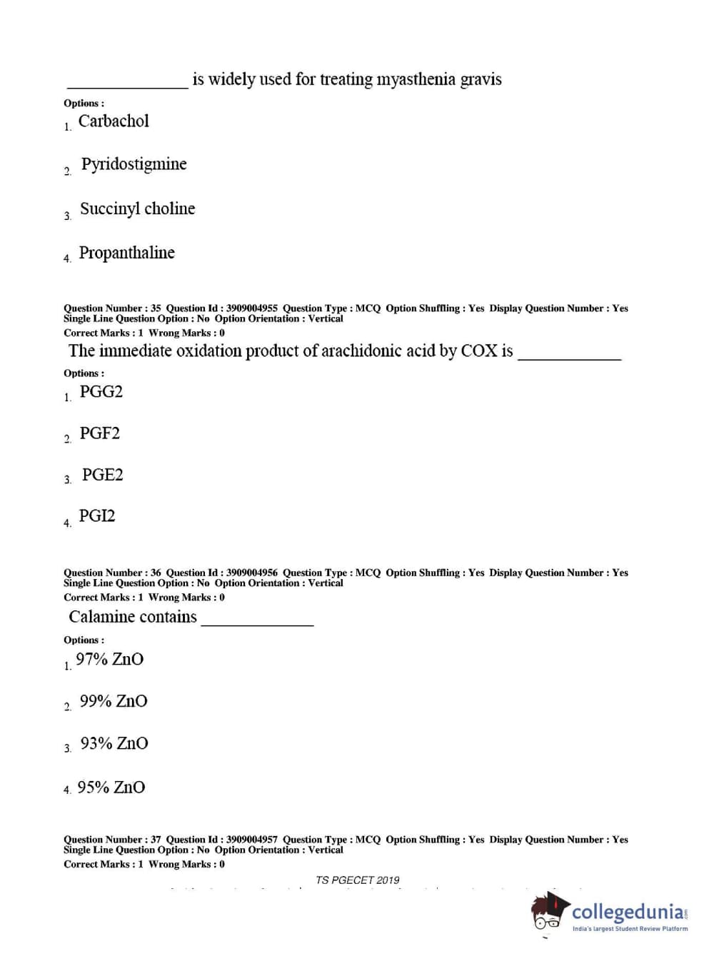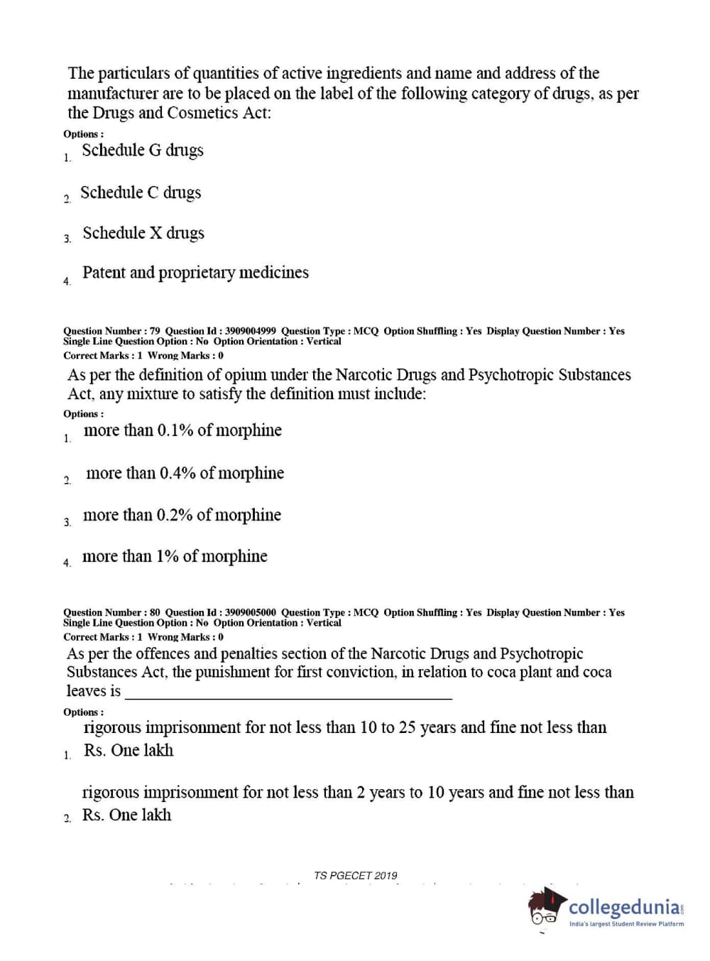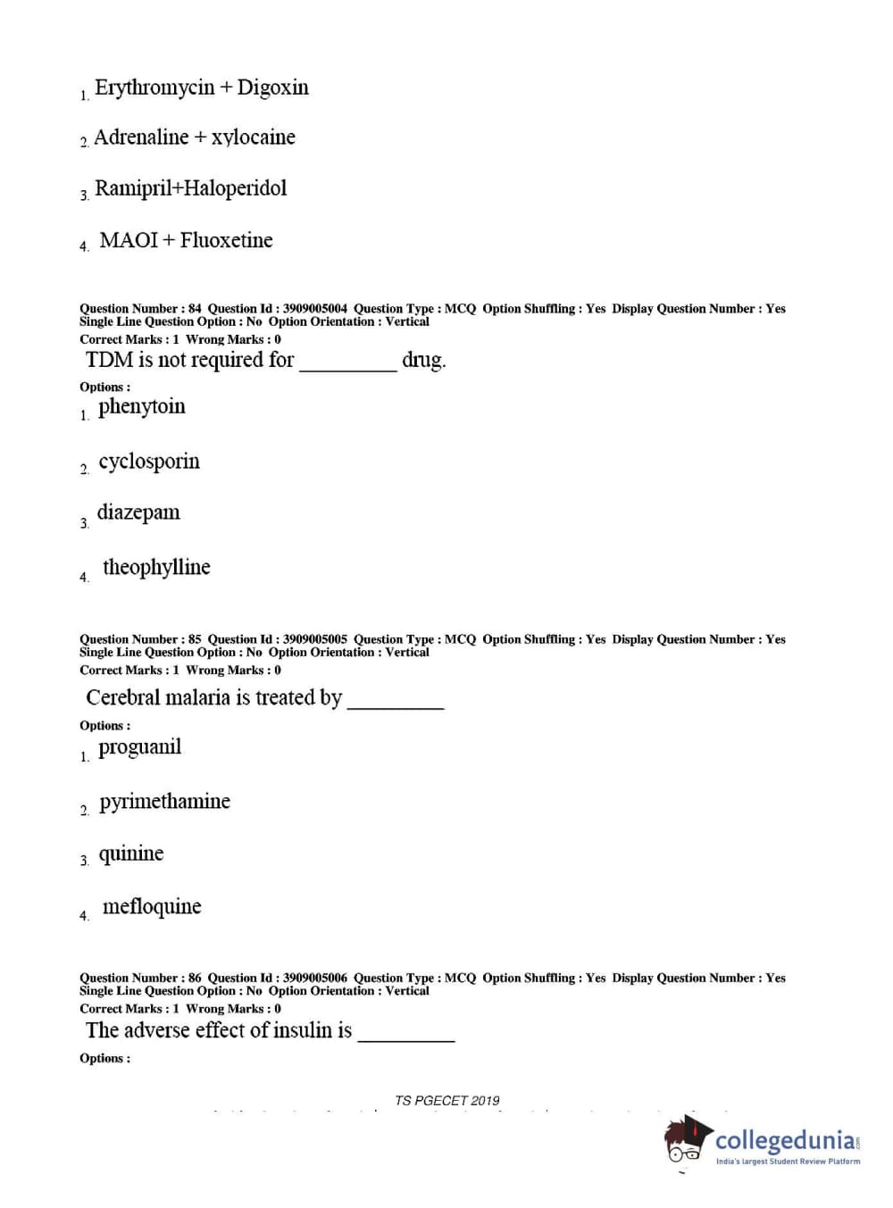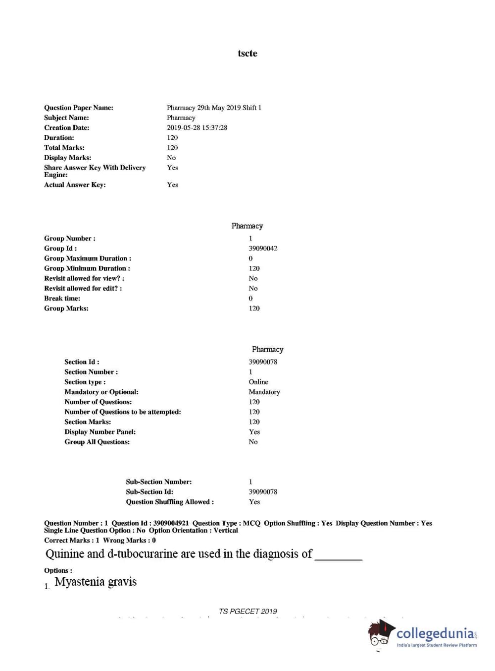 TS PGECET 2019 Pharmacy Question Paper with Answer Key PDF for