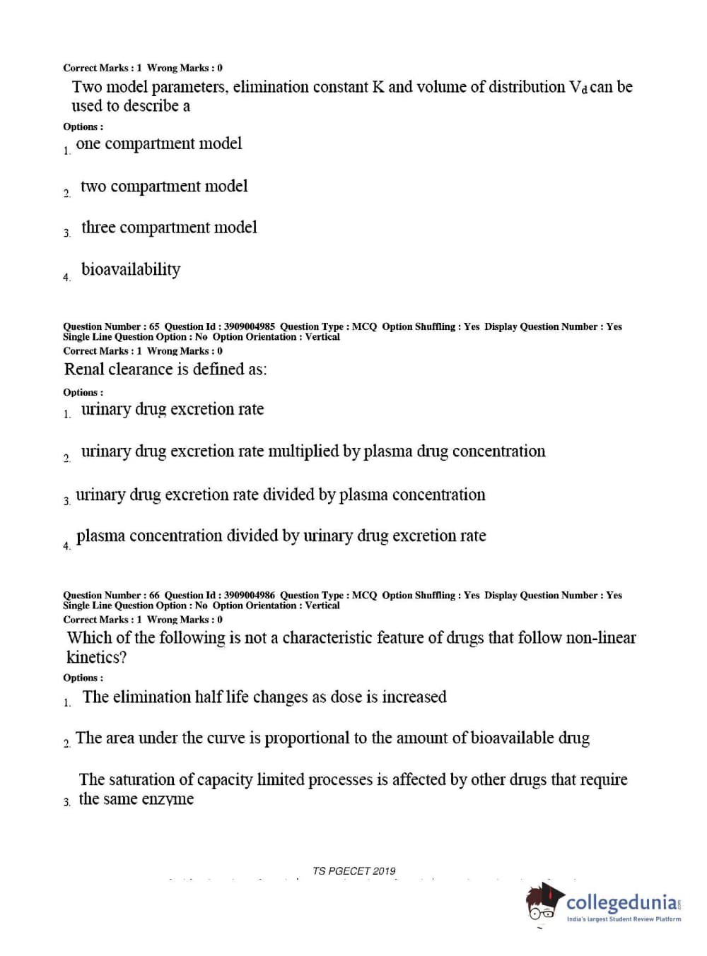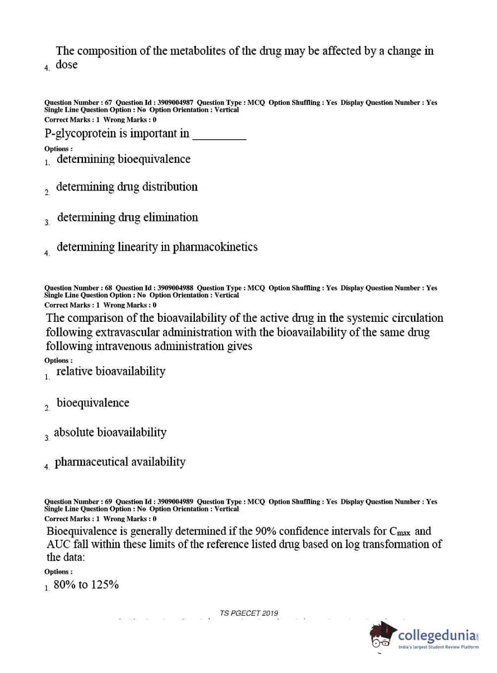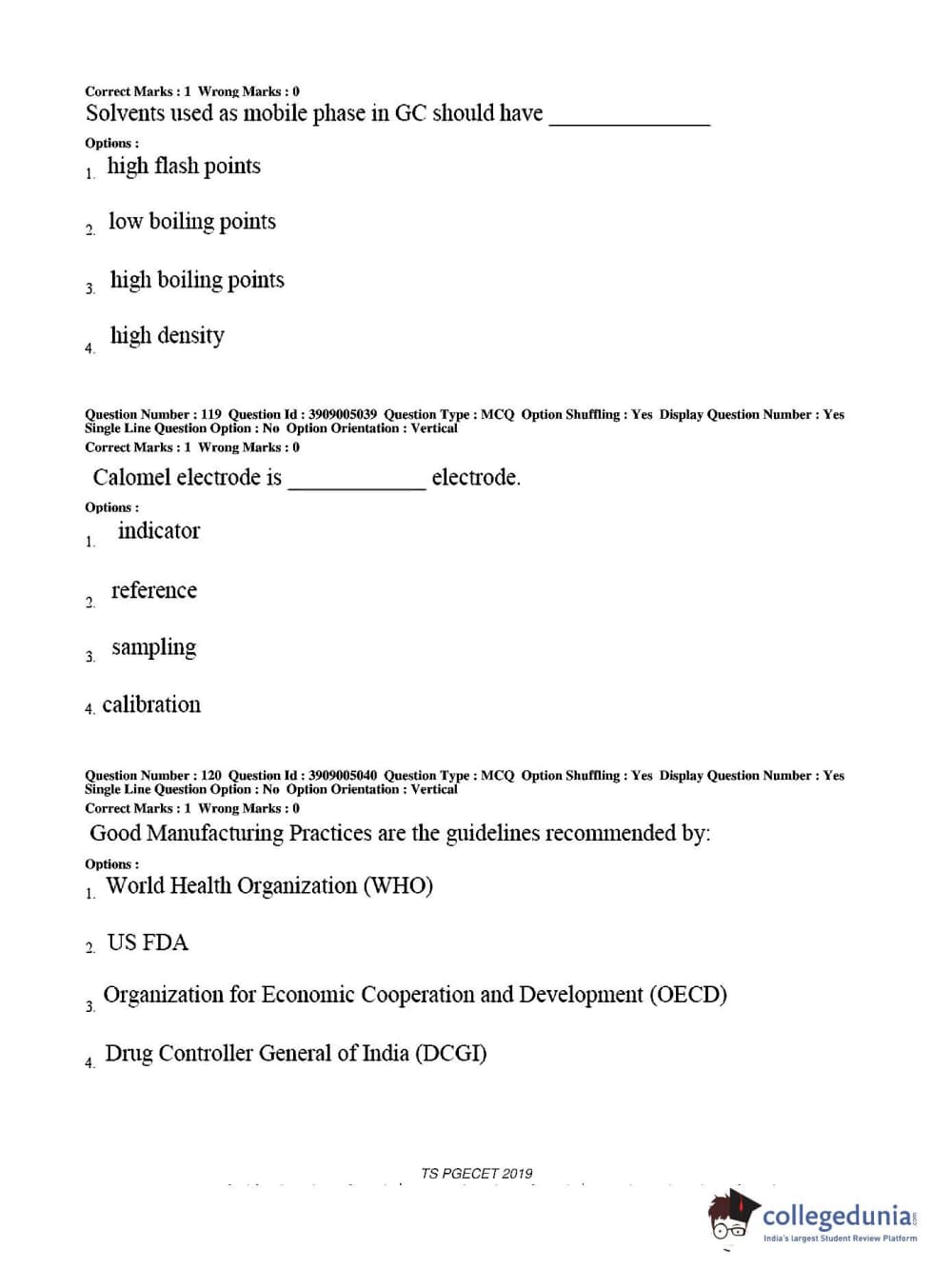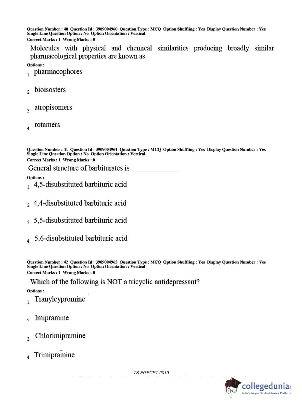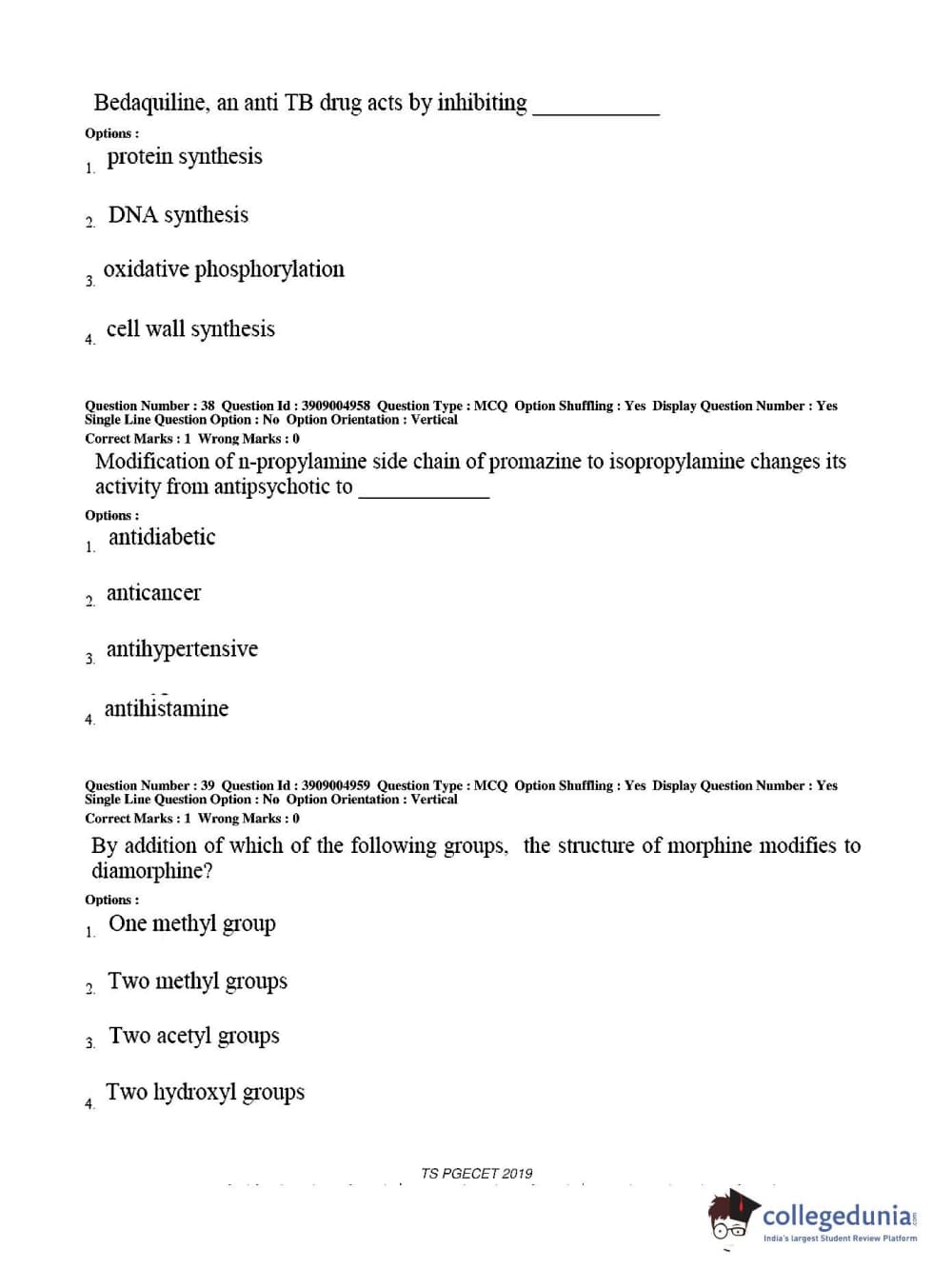 TS PGECET 2019 Pharmacy Question paper with answer key pdf conducted on May 29, 2019 from is available for download. The exam was successfully organized by Osmania University. The question paper comprised a total of 120 questions.