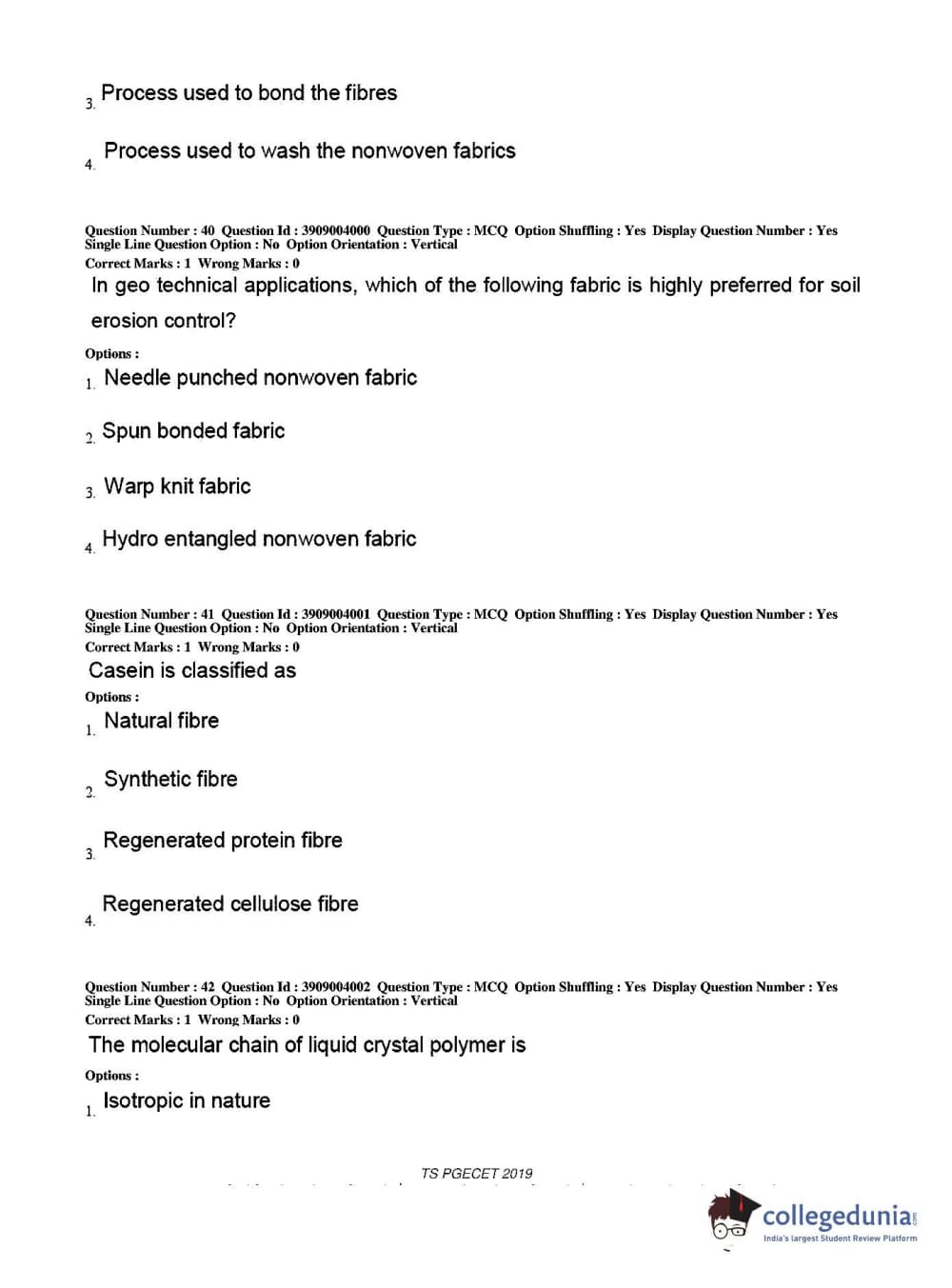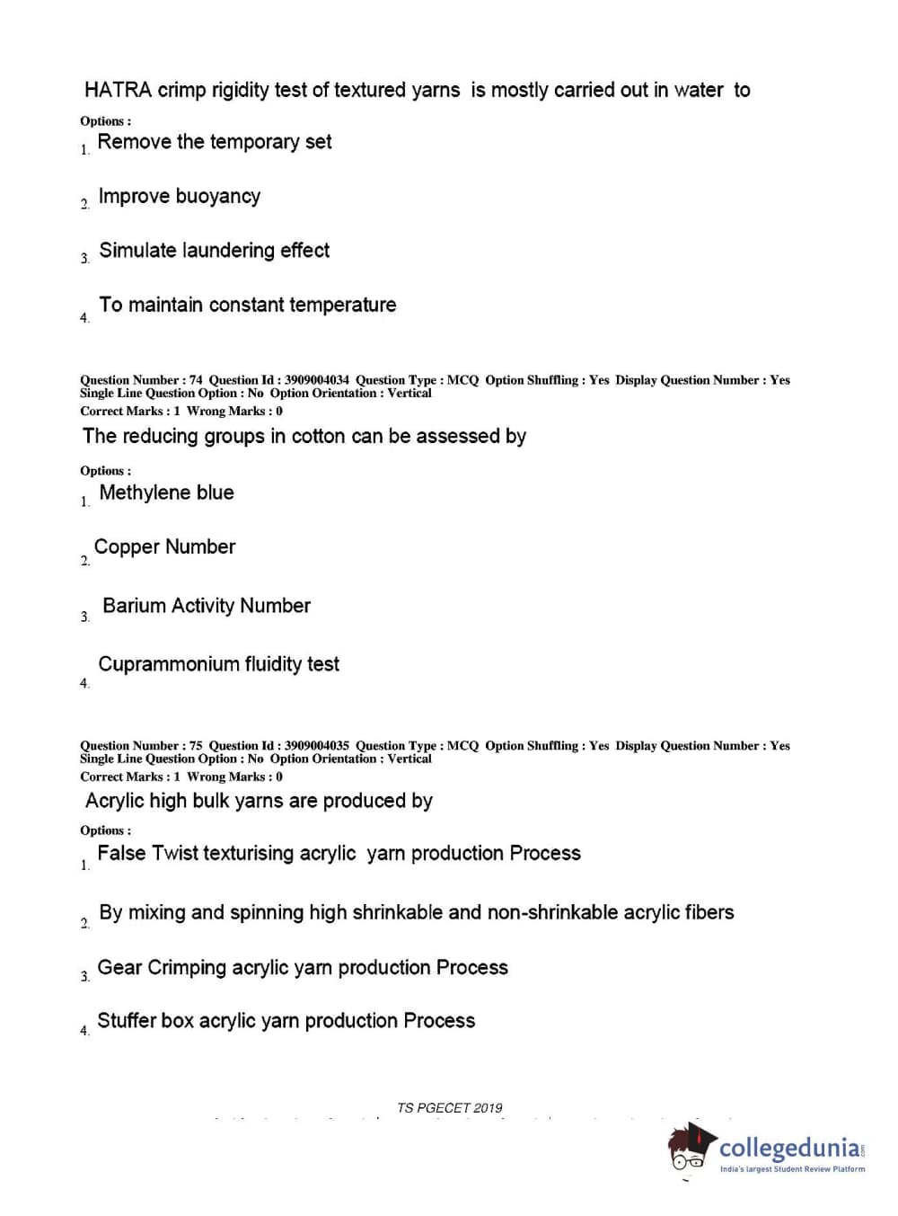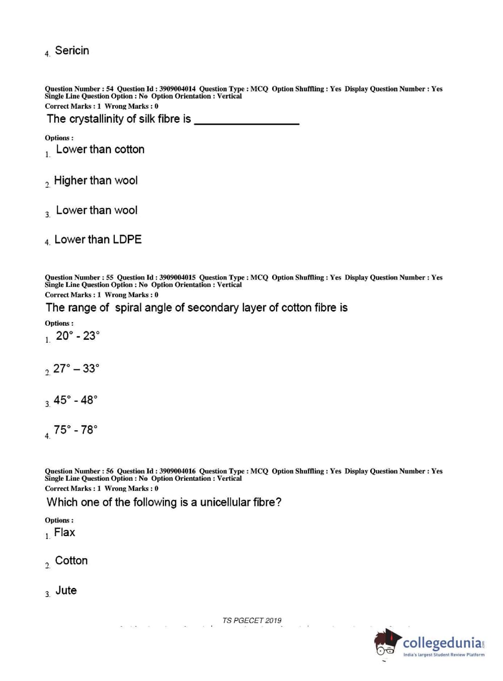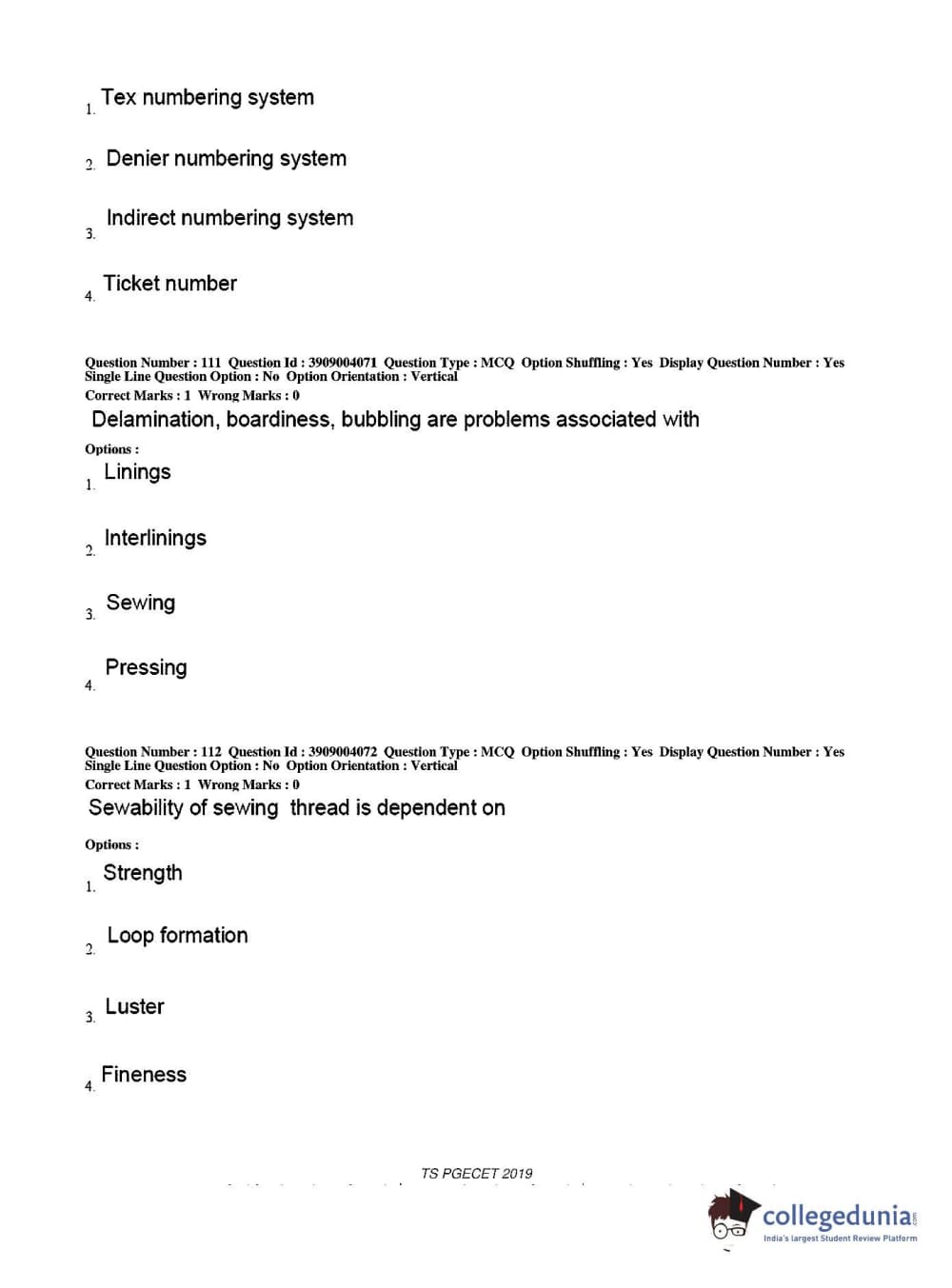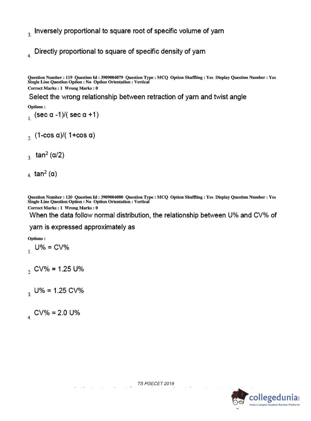 TS PGECET 2019 Textile Technology Question paper with answer key pdf conducted on May 28, 2019 from is available for download. The exam was successfully organized by Osmania University. The question paper comprised a total of 120 questions.