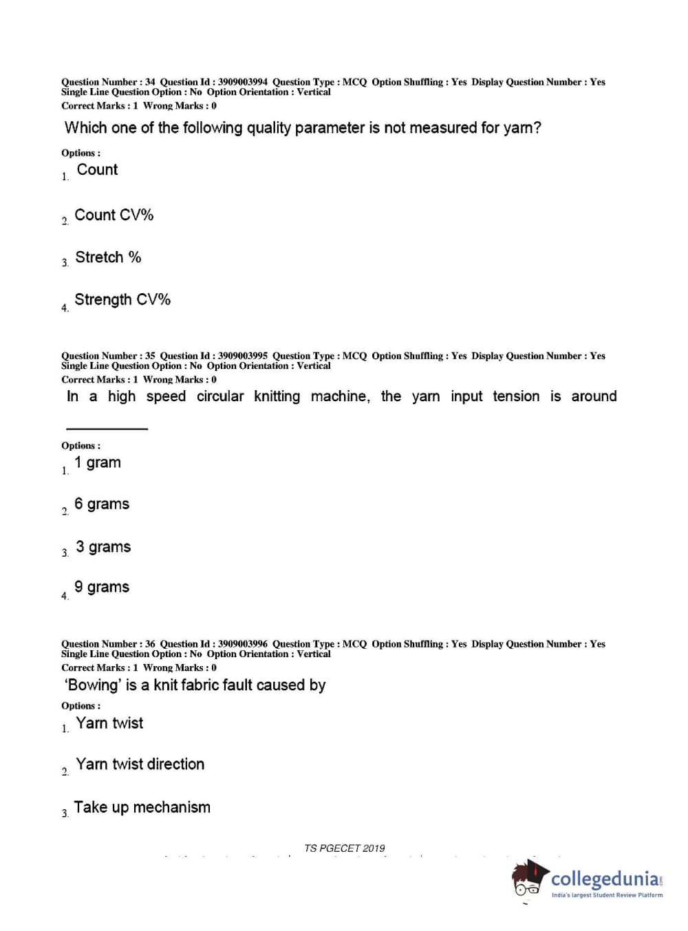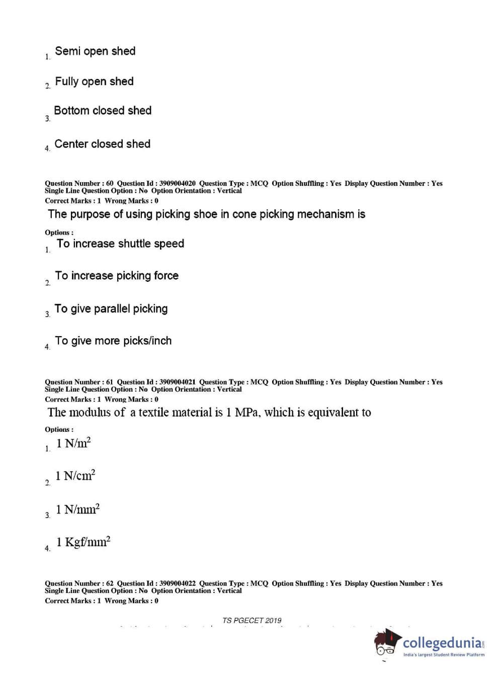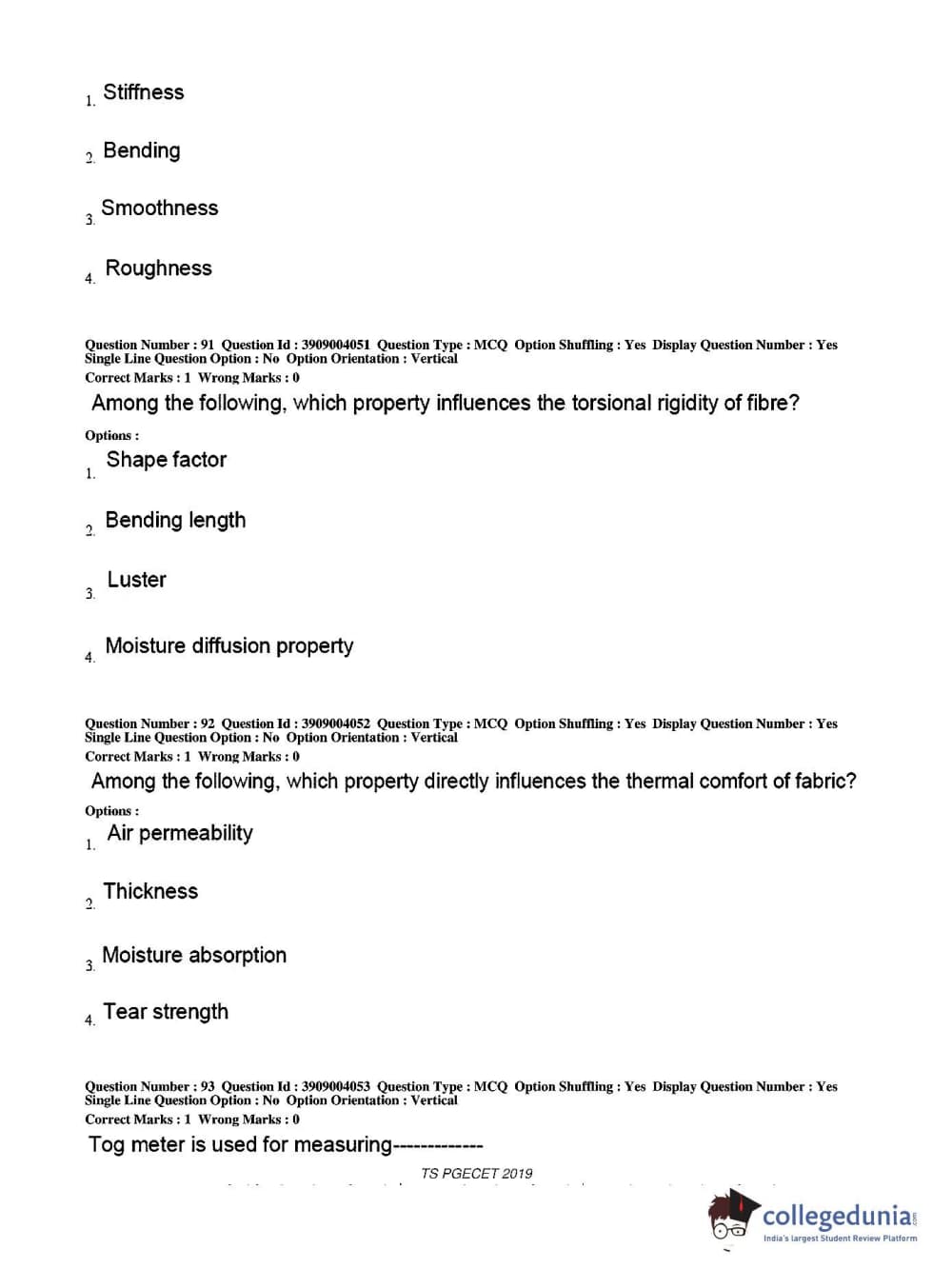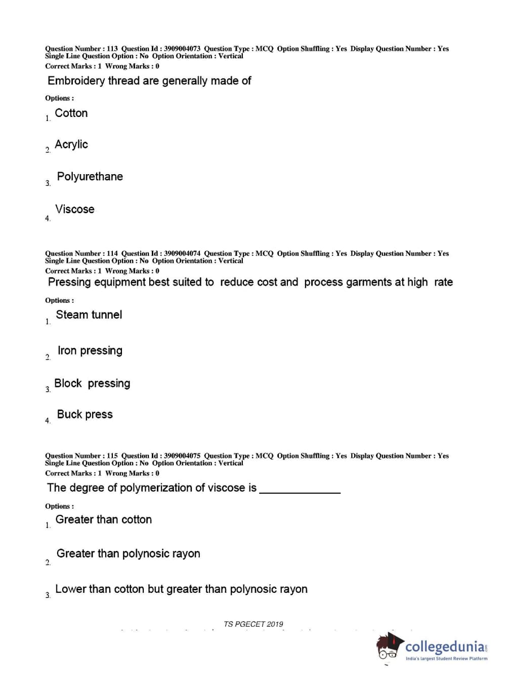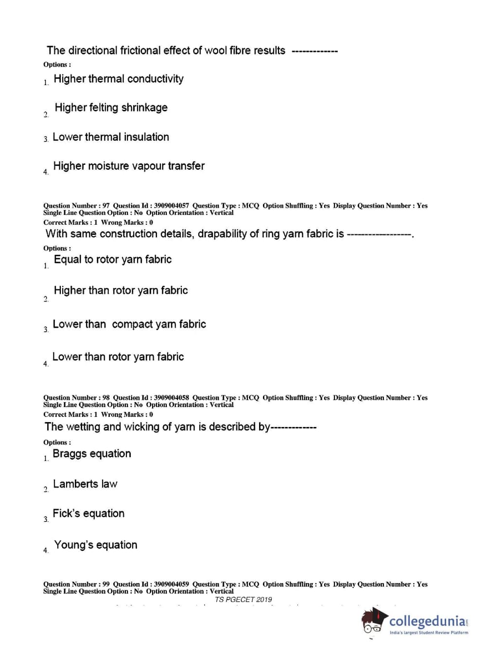 TS PGECET 2019 Textile Technology Question paper with answer key pdf conducted on May 28, 2019 from is available for download. The exam was successfully organized by Osmania University. The question paper comprised a total of 120 questions.
