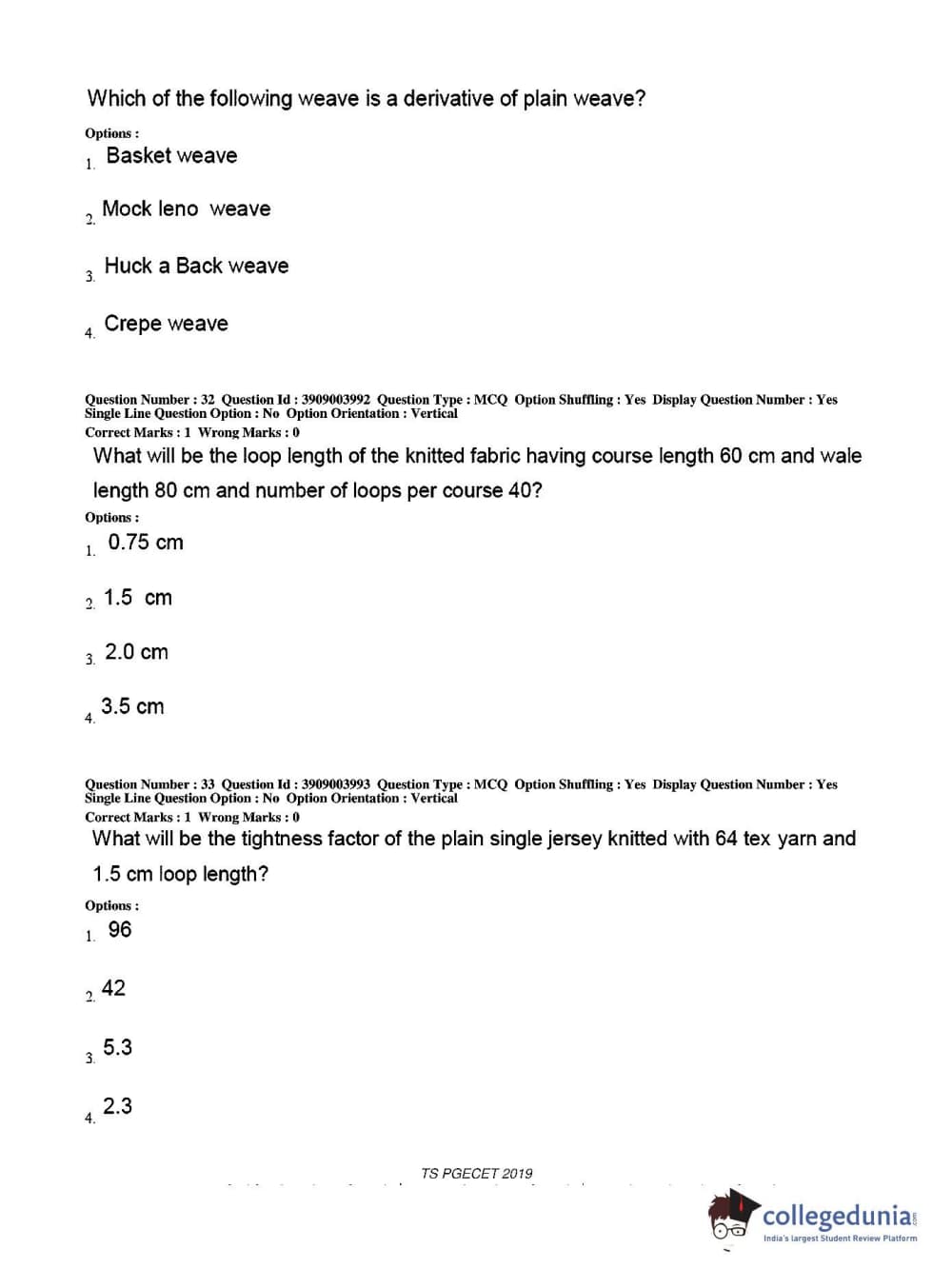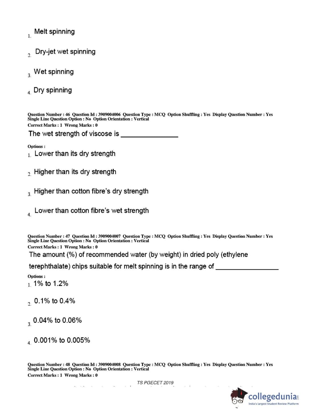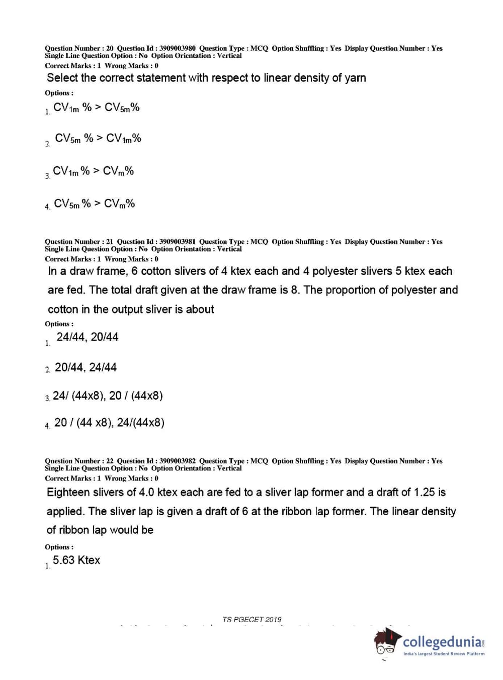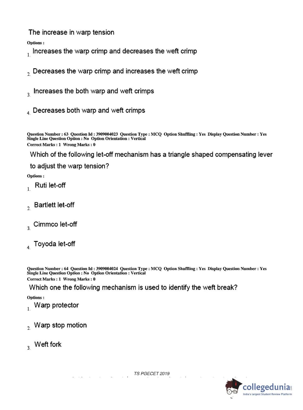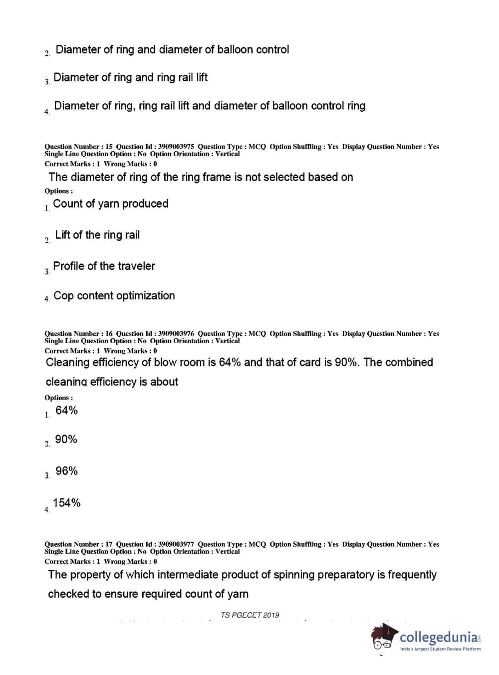 TS PGECET 2019 Textile Technology Question paper with answer key pdf conducted on May 28, 2019 from is available for download. The exam was successfully organized by Osmania University. The question paper comprised a total of 120 questions.